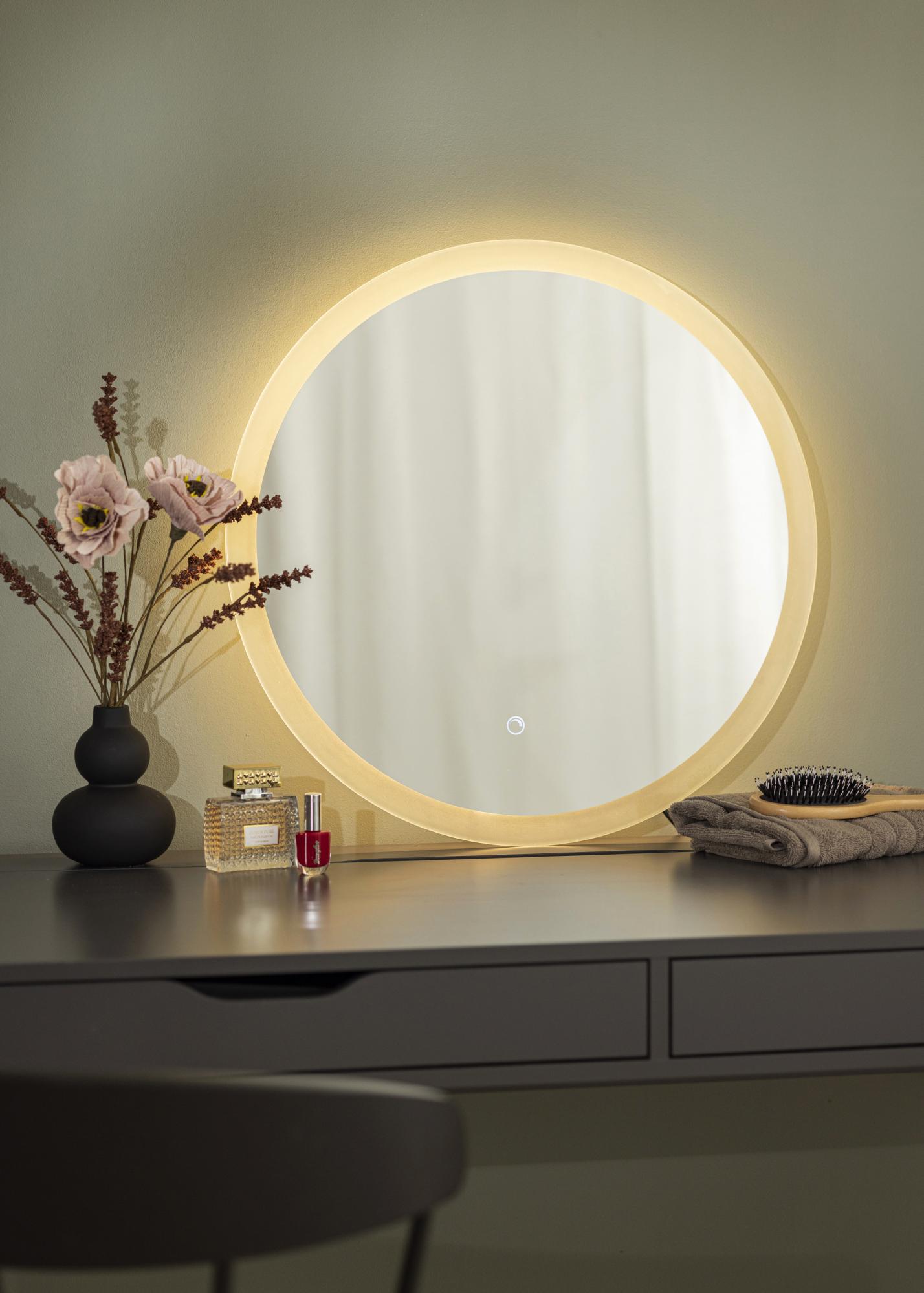 The lighting has a pleasant glow which you can adjust. Simply hold the touch button in the lower edge of the mirror for a few seconds. The mirror is intended for permanent installation and should be installed by an electrician. For the mirror to function correctly, it must be connected to a standard switch, not a dimmer switch.