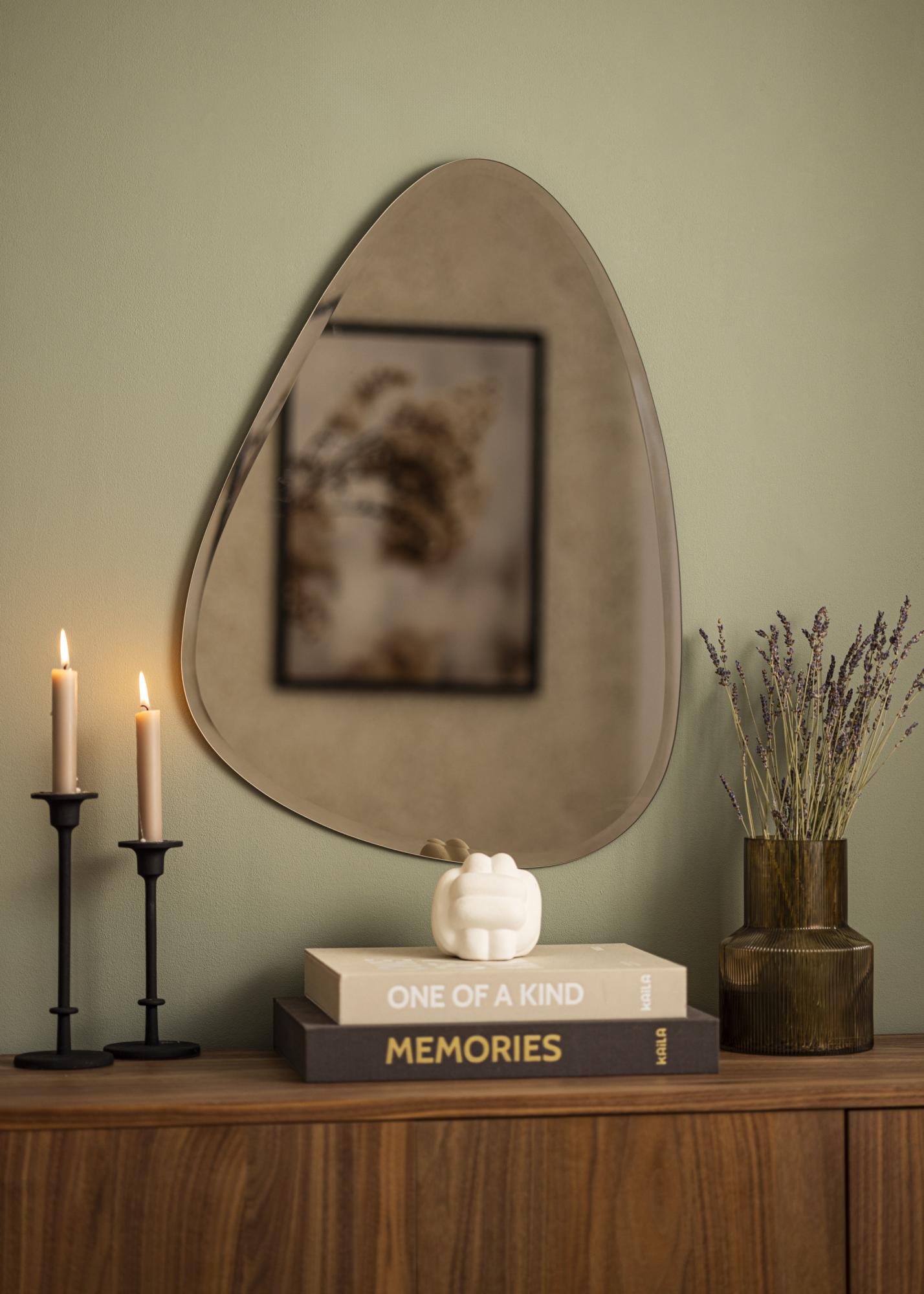 This is an asymmetrical wall mirror from KAILA made with modern bronze tinted mirror glass. Mirrors with darker mirror glass are dramatic decor details perfect for modern homes. The thin mirror is frameless. Instead, the edges of the mirror are decorated with an elegant faceted edge.