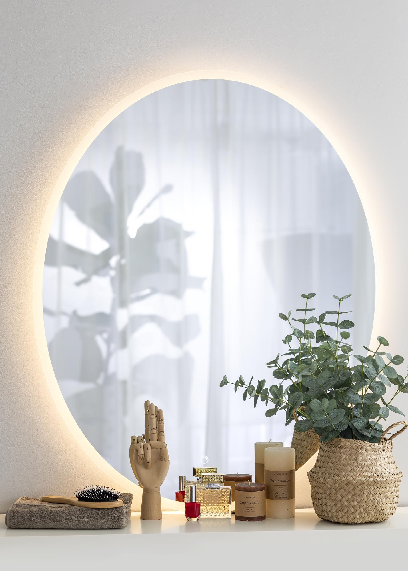 With its oval shape and integrated LED lighting, this really is a bathroom mirror with an elegant design! The integrated LED is dimmable, and can be adjusted by pressing the watertight touch button on the screen. The mirror is lit from behind by a warm, white 3000K light, which gives a beautiful glow at the front. LED is an energy efficient light source that makes for an even and natural light. The mirror is approved for bathroom use. This mirror is intended for fixed installation and for connecting to a light switch. For the mirror to function correctly, it must be connected to a standard switch, not a dimmer switch.