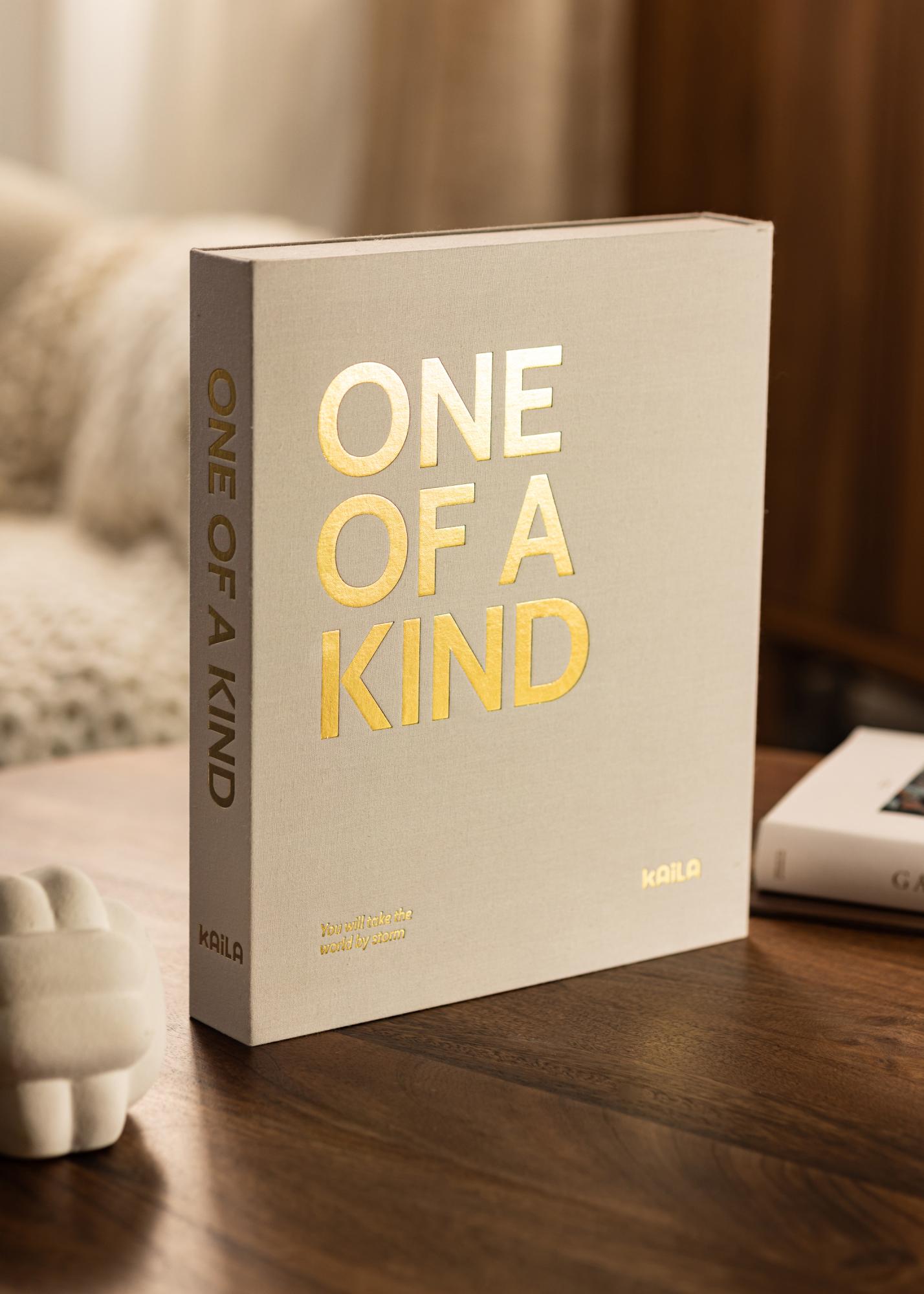 Develop your pictures and preserve them in a beautiful Coffee Table Photo Album! This photo album from KAILA is bound in cream-coloured cloth and shaped like a box, giving it a truly exclusive feel. The best thing about this photo album is that it is just as attractive as the rest of your decor! On the front of the photo album, you'll find the words ”ONE OF A KIND” printed in large, gold letters, along with the subtitle ”You will take the world by storm”. This makes this album perfect for childhood pictures or as a present to someone special. Or, of course, just for your own lovely photos.