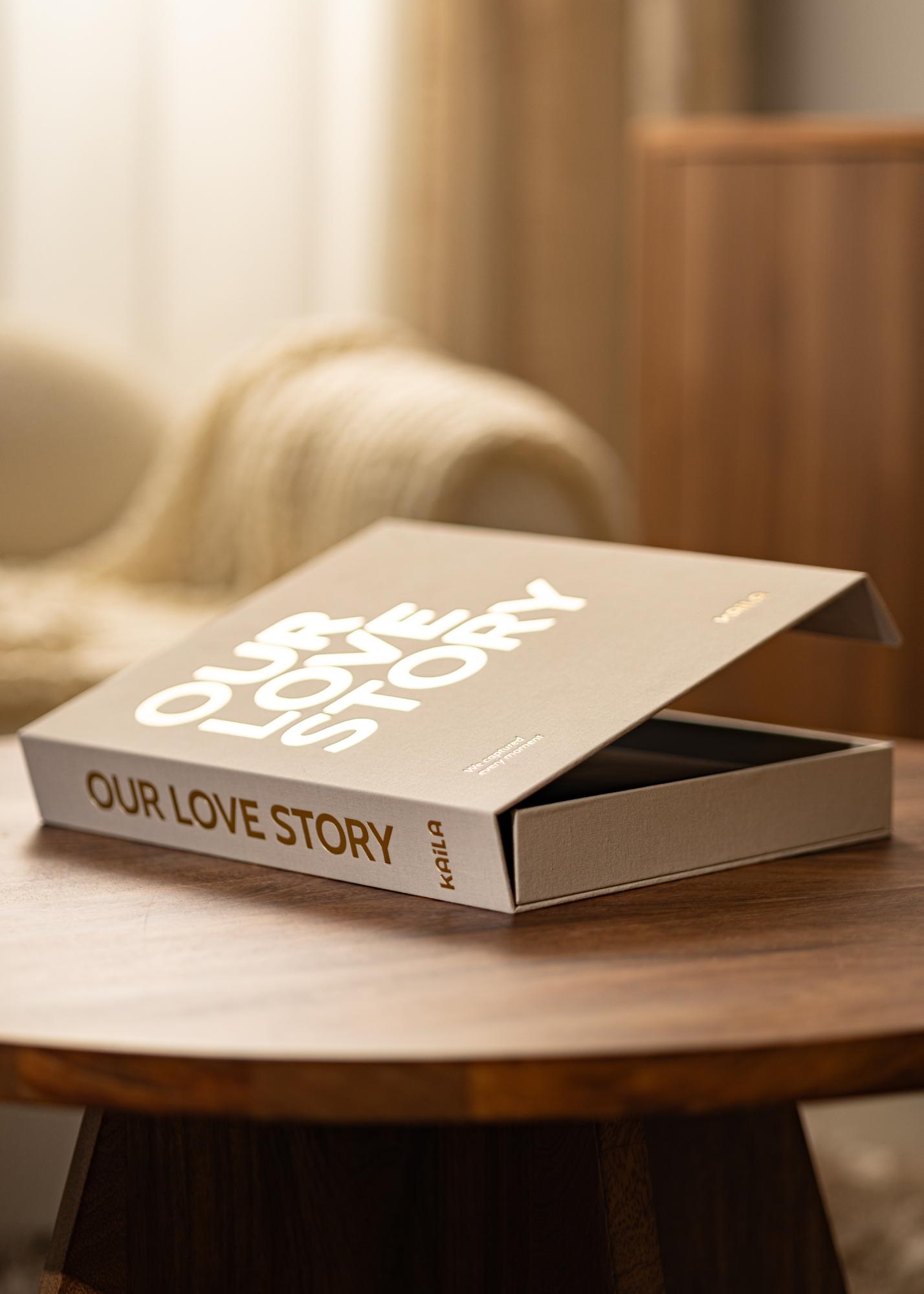This is a photo album and a Coffee Table Book combined in one, making for a decorative detail in your home. This lovely cream-coloured photo album is designed like a clothbound box. On the front of the photo album, you'll find the words ”OUR LOVE STORY” printed in large, white letters, along with the subtitle ”We captured every moment”. This makes this album perfect for pictures from your closest relationships, or as a beautiful present for someone. Why not use this elegant photo album for storing beautiful wedding photos? On the inside of the album, you'll find a beautiful and discreet print on the inside cover, and a ring binder with 30 black sheets (60 pages) where you can stick your photos in yourself, giving you the opportunity to be creative.