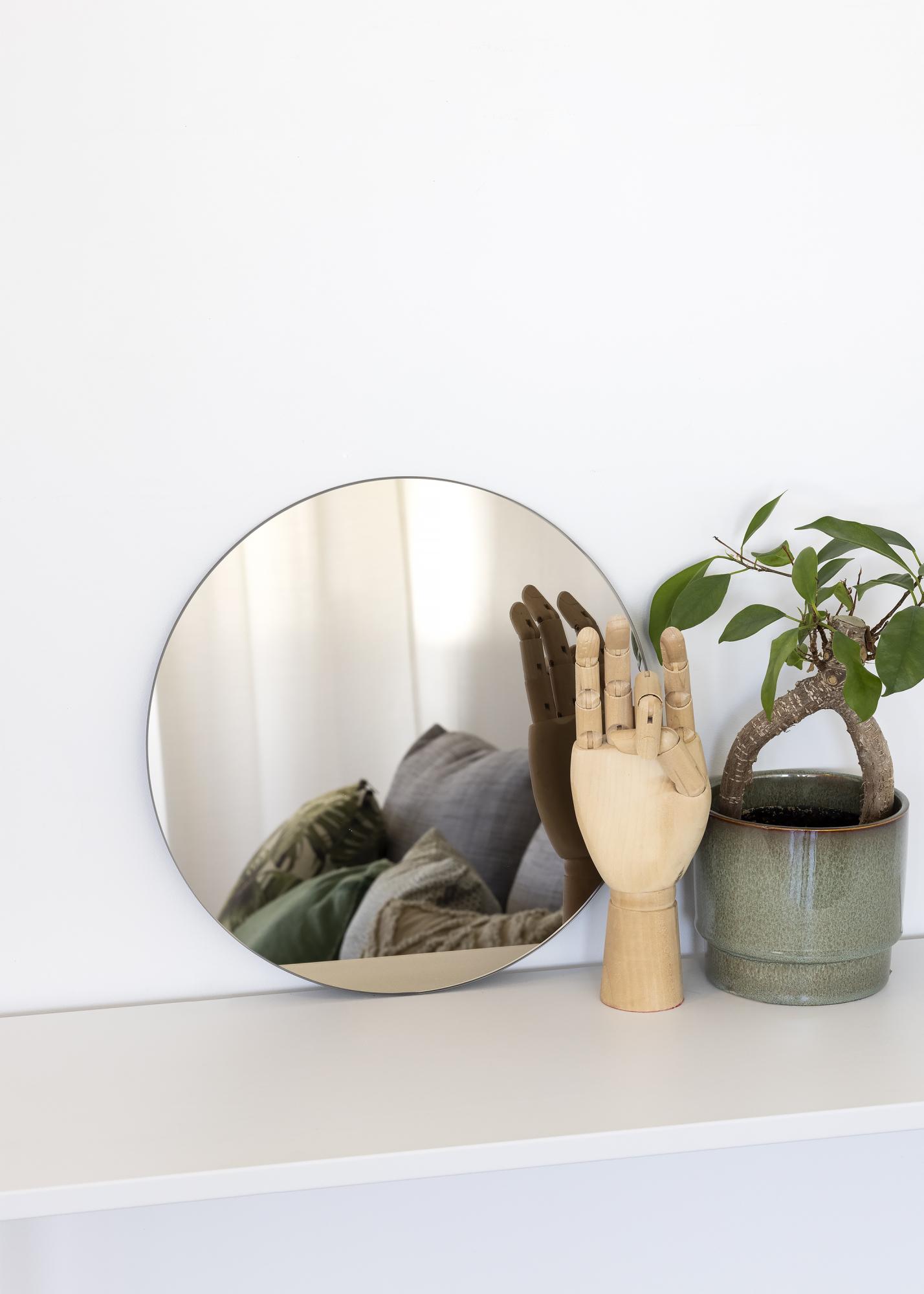 This round mirror has a thin, unframed design, creating an elegant and exclusive look that adds a splash of style to any room. With bronze-coloured mirror glass, this wall mirror offers a rich and cosy appearance that fits perfectly in modern homes. The mirror is part of a series of round, bronze-coloured mirrors from KAILA with seven different sizes, giving a wide range of choice. This model has a diameter of 30 cm. You can easily hang the mirror in the hall or living room using the mirror's wall bracket.