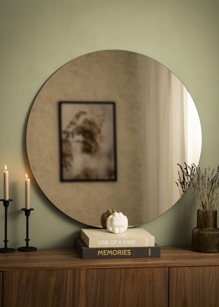 This round mirror has a thin, unframed design, creating an elegant and exclusive look that adds a splash of style to any room. With bronze-coloured mirror glass, this wall mirror offers a rich and cosy appearance that fits perfectly in modern homes. The mirror is part of a series of round, bronze-coloured mirrors from KAILA with seven different sizes, giving a wide range of choice. This model has a diameter of 90 cm. You can easily hang the mirror in the hall or living room using the mirror's wall bracket.