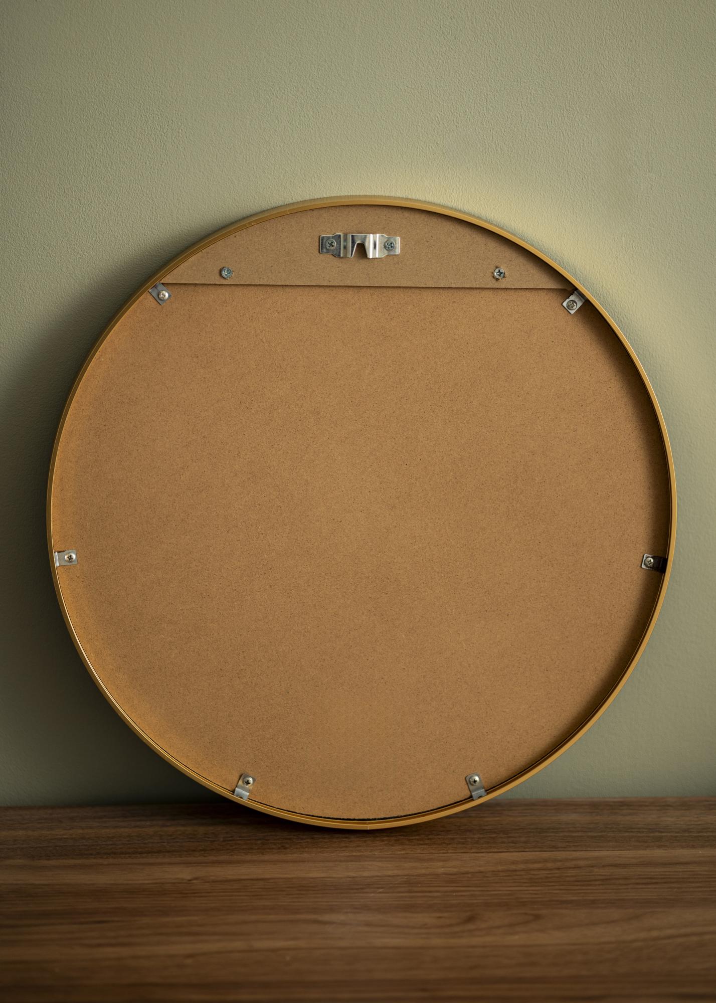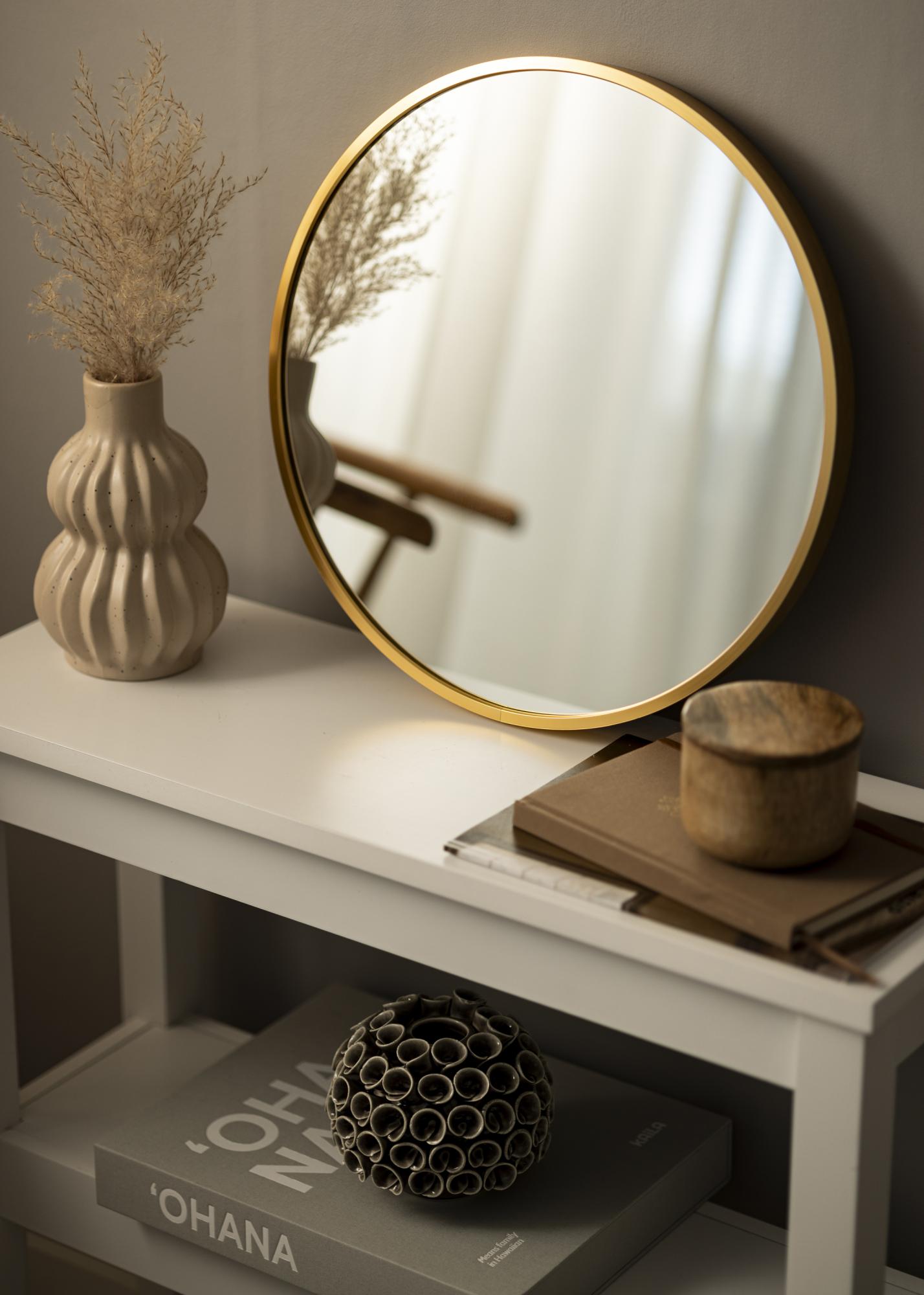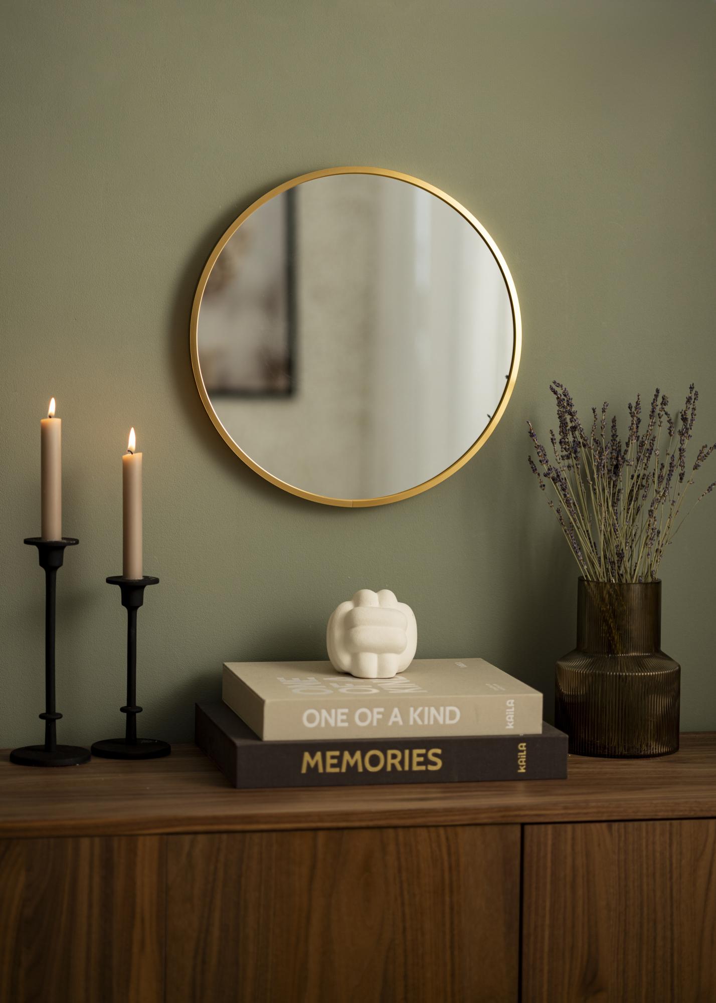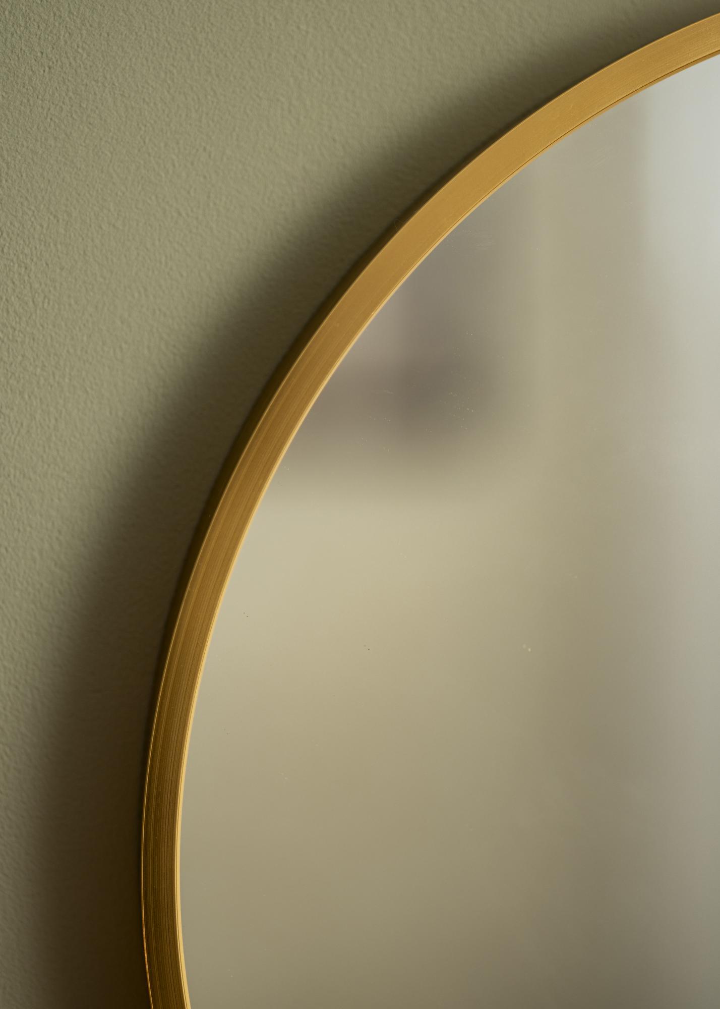 A round mirror in a stylish Swedish design with a metal frame in beautiful gold. The frame has a brushed surface, which gives the lovely gold colour a slightly duller look. It also has a trendy frame that's thin but at the same time deep - between 30-40 mm deep depending on the size - meaning that it stands slightly off of the wall for a cool 3D effect. The frame's depth also makes the mirror feel solid and robust, without affecting its minimalist feel.