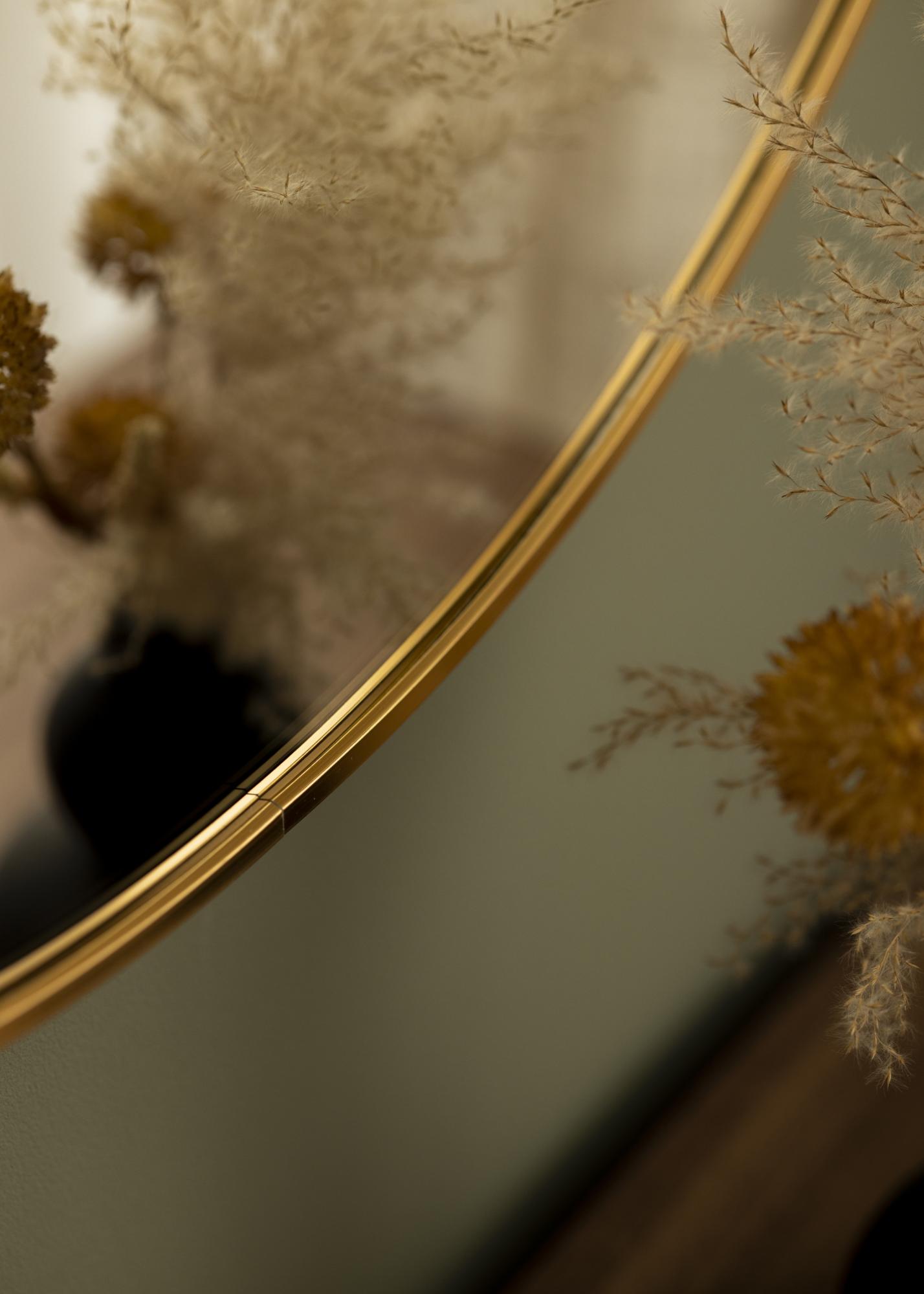 A round mirror in a stylish Swedish design with a metal frame in beautiful gold. The frame has a brushed surface, which gives the lovely gold colour a slightly duller look. It also has a trendy frame that's thin but at the same time deep - between 30-40 mm deep depending on the size - meaning that it stands slightly off of the wall for a cool 3D effect. The frame's depth also makes the mirror feel solid and robust, without affecting its minimalist feel.