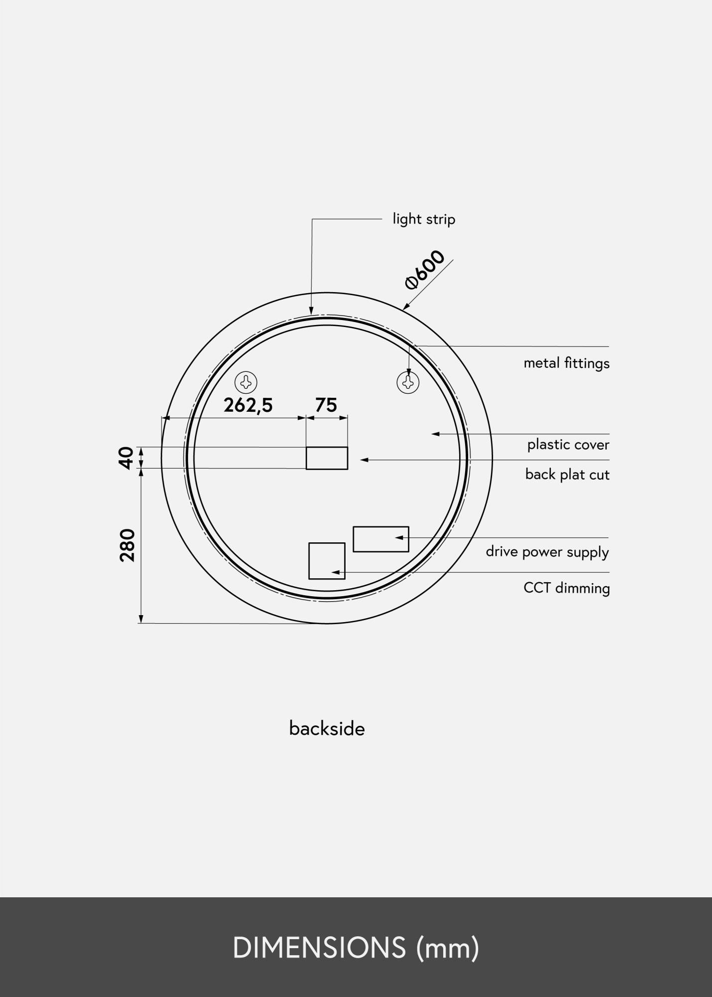 The mirror is approved for bathroom use, but its timeless and elegant design looks great on any of the home’s other walls! The mirror has a 60 cm diameter, is just 3 cm deep, and comes with wall fixings. This mirror is intended for fixed installation and for connecting to a light switch. For the mirror to function correctly, it must be connected to a standard switch, not a dimmer switch.