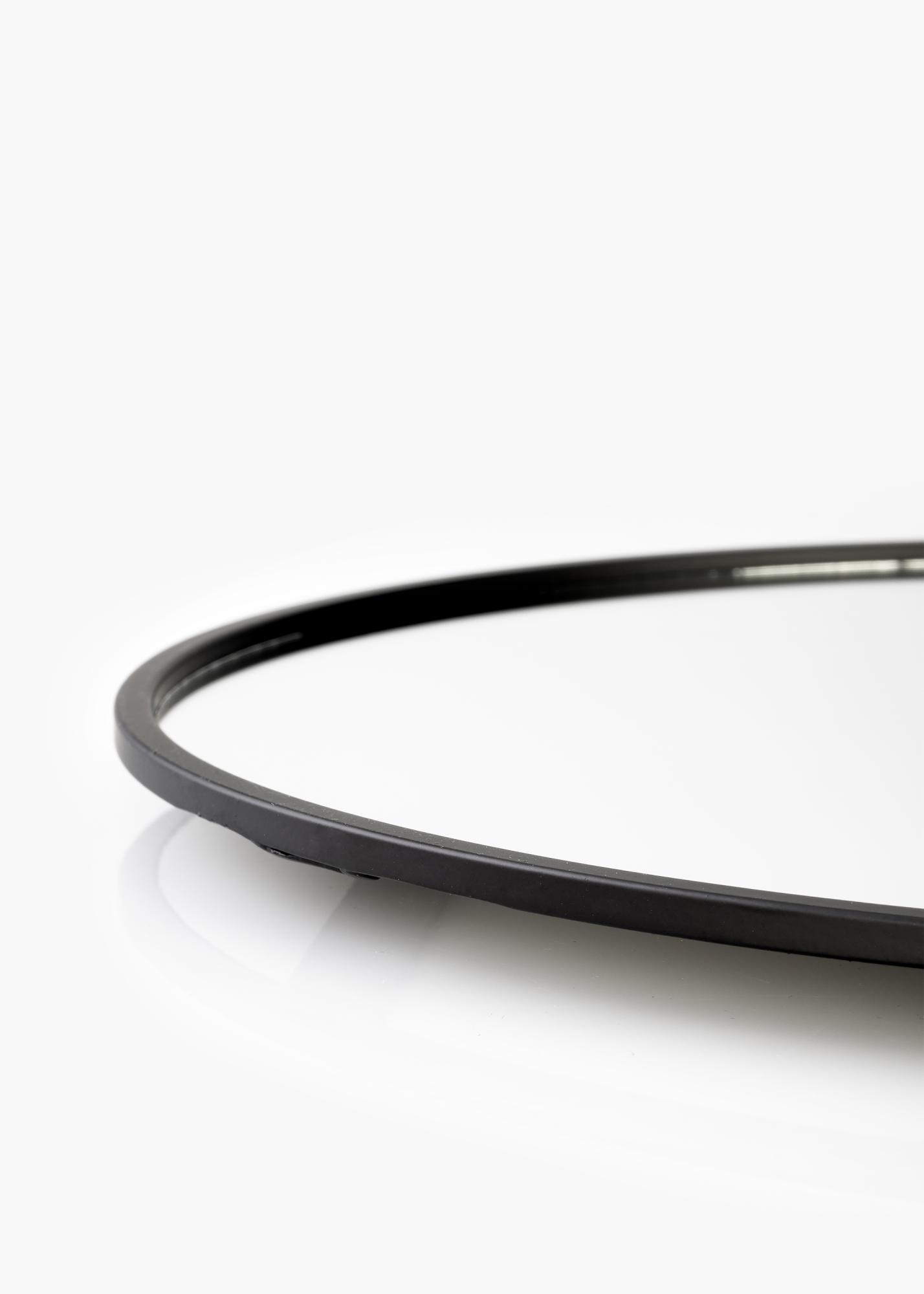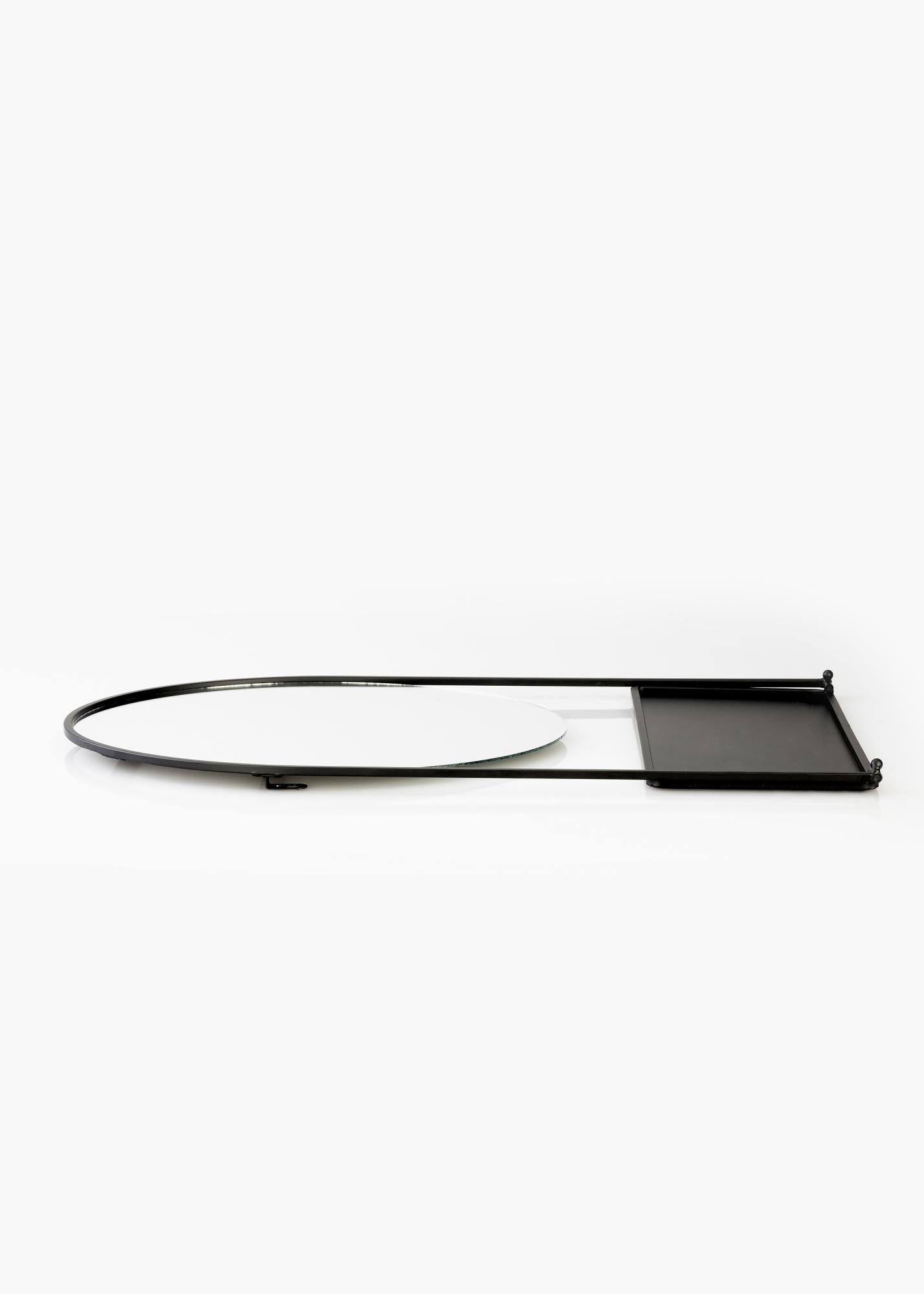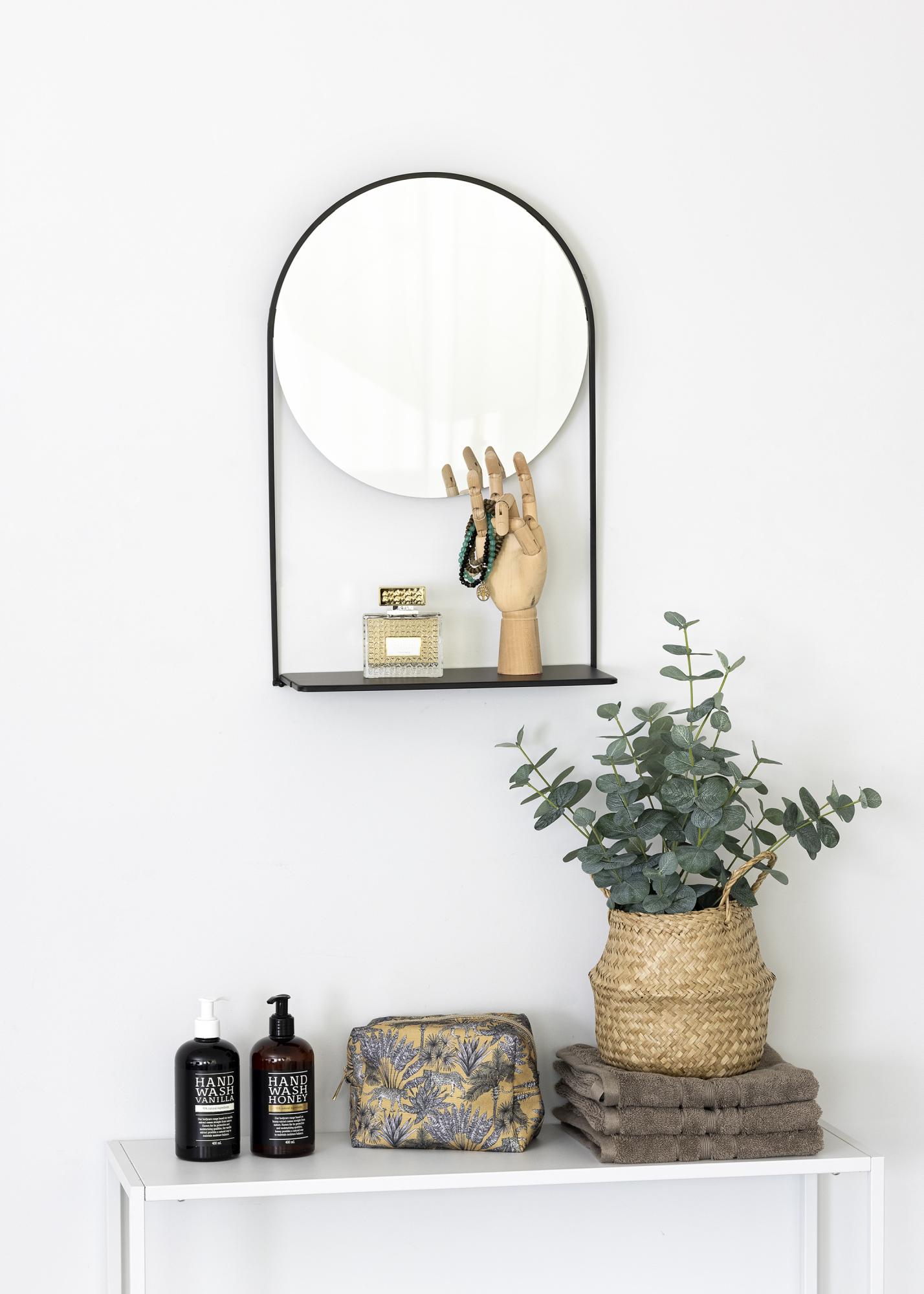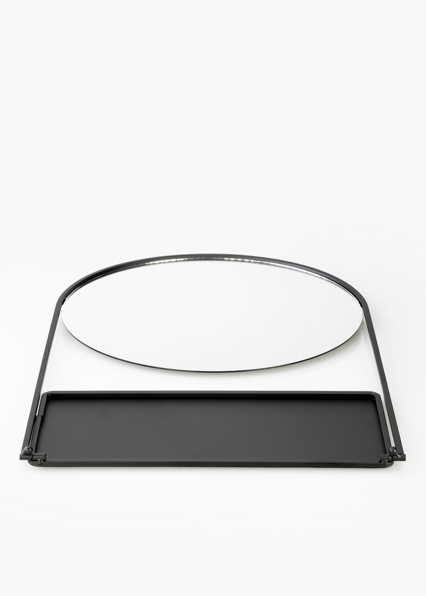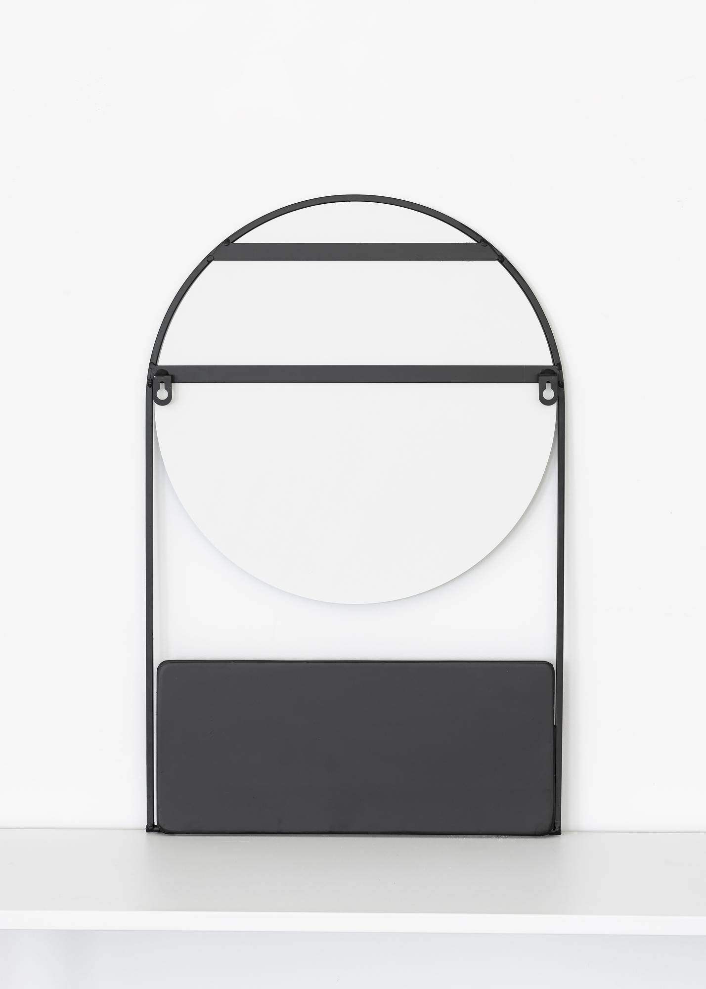 This stylish wall mirror with shelf is a piece of Swedish design from KAILA. This mirror is black and made from metal. The mirror's surface is round and has a diameter of 35 cm. It has a black metal edge and a shelf - perfect for putting nice decorations on or storing a little makeup! This mirror measures 35x55 cm and comes with wall fixings.