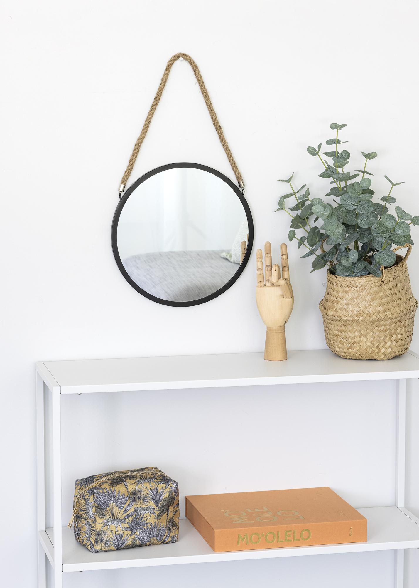 This is a round wall mirror. Perfect for those who like decor inspired by the sea! This mirror is made from metal and has a decorative hemp rope for hanging. Wall fixings included. The mirror's glass is framed by a black edge that gives this mirror a stylish depth. It has a diameter of 30 cm.