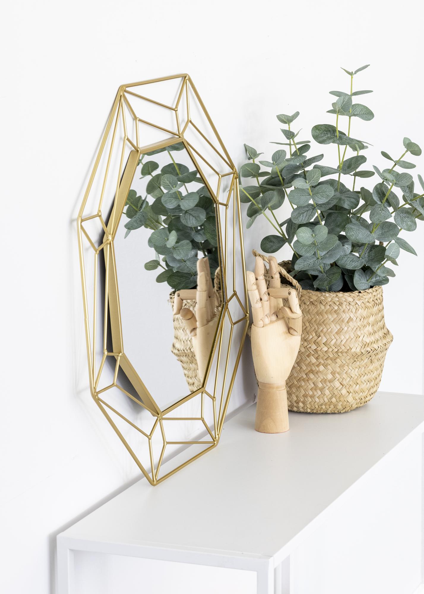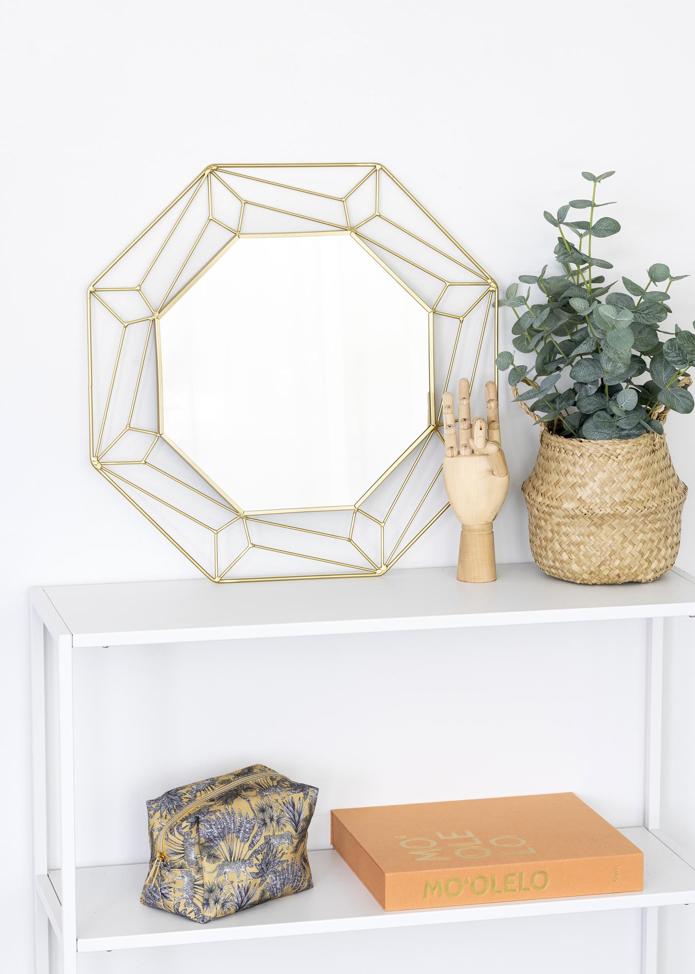 This is a new mirror with an attractive abstract design from KAILA! The hexagonal surface in the middle is surrounded by a beautiful patterned edge consisting of bronze-coloured metal. The golden colour gives this mirror a luxurious touch. It's an especially good choice, therefore, for those who want a stylish and elegantly decorated home! This mirror measures 50x50 cm and is made from metal. Wall fixings are attached to the back of the mirror.