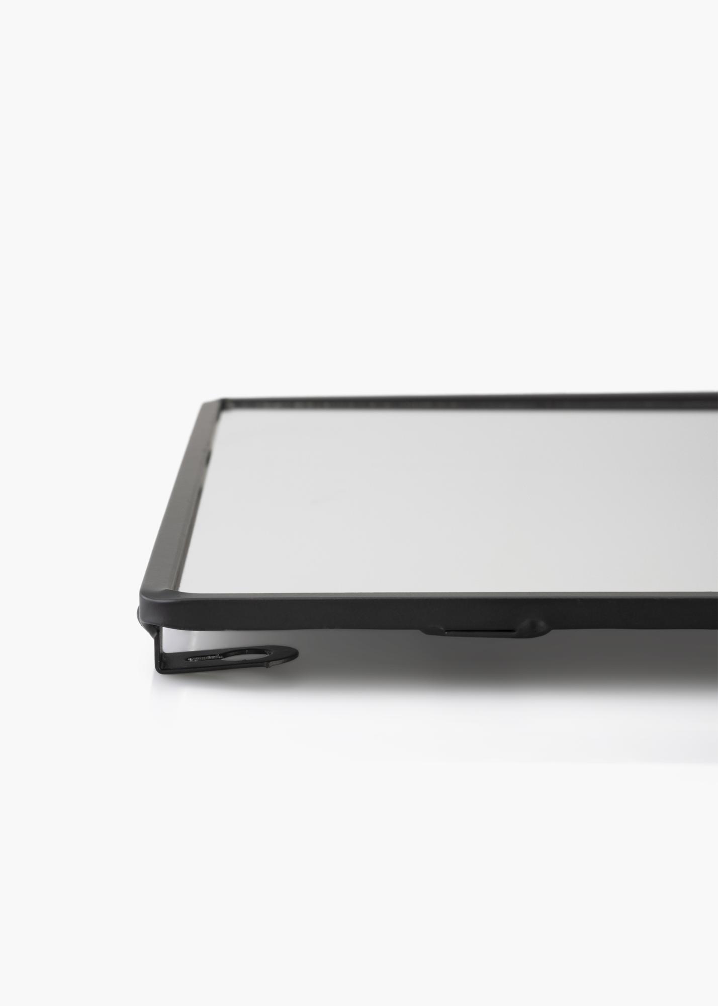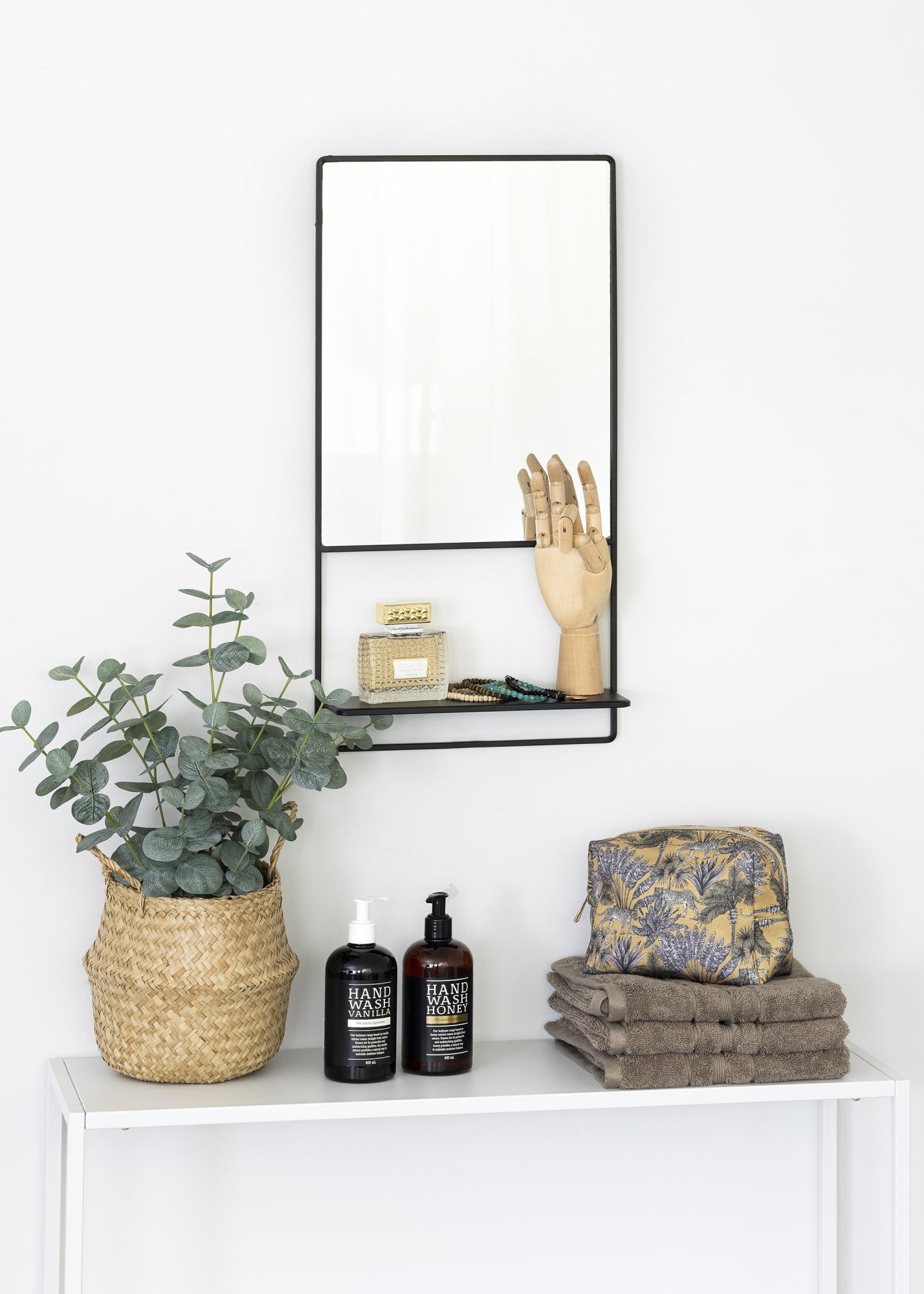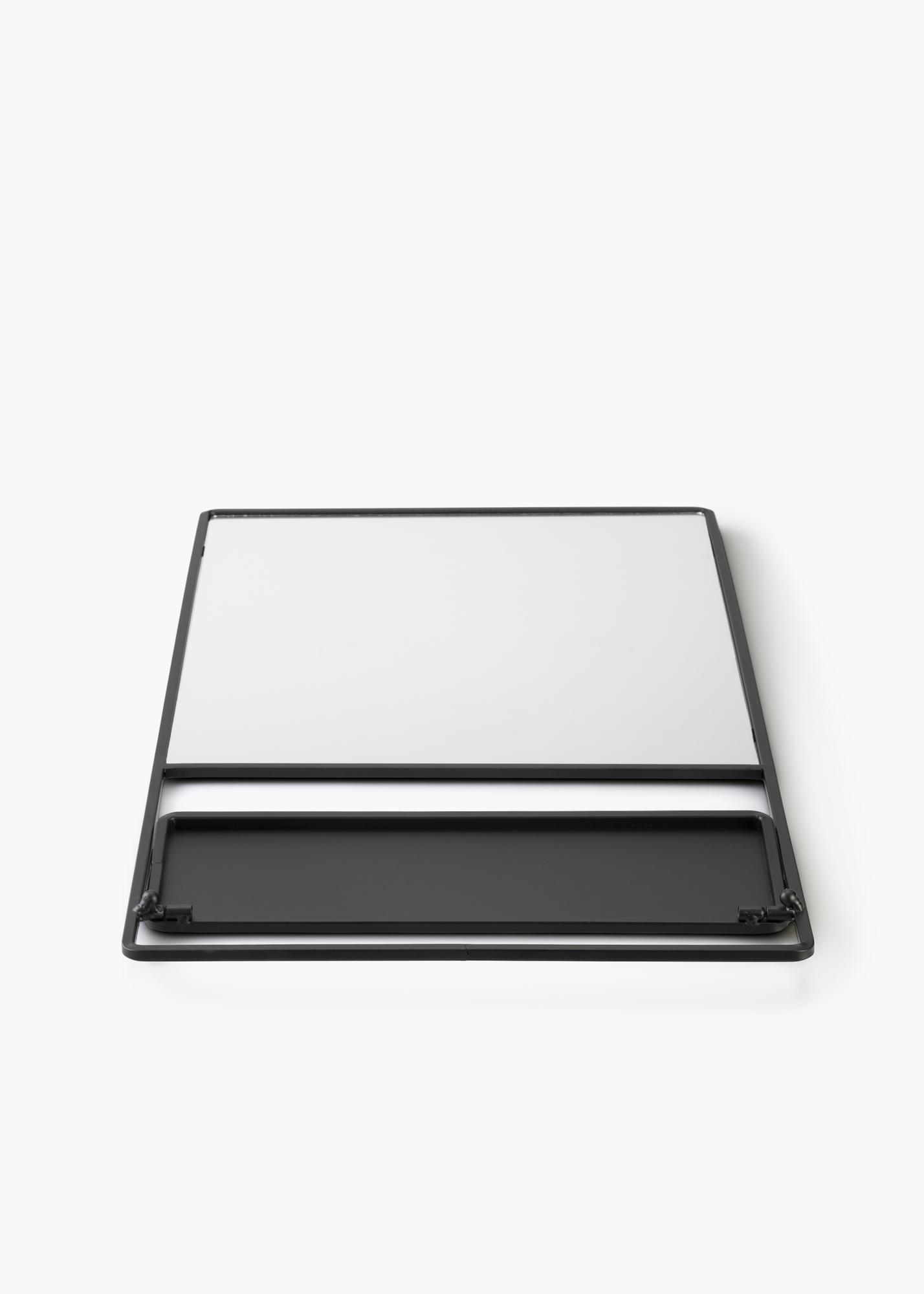 This stylish wall mirror with shelf is a piece of Swedish design from KAILA. This mirror is black and made from metal. The mirror's rectangular surface is surrounded by a black metal edge. Below the mirror sits a shelf - perfect putting nice decorations on or storing a little makeup! This mirror measures 31x60 cm and comes with wall fixings.