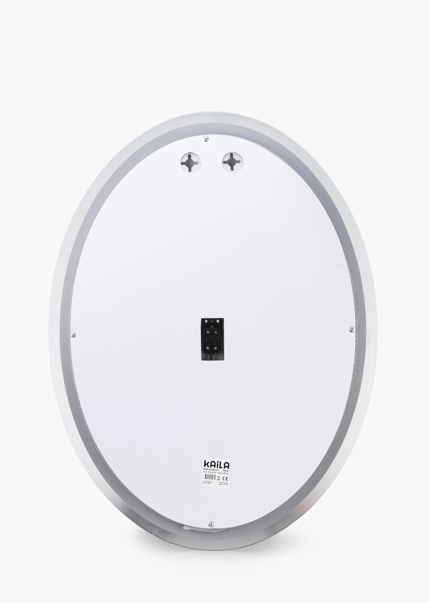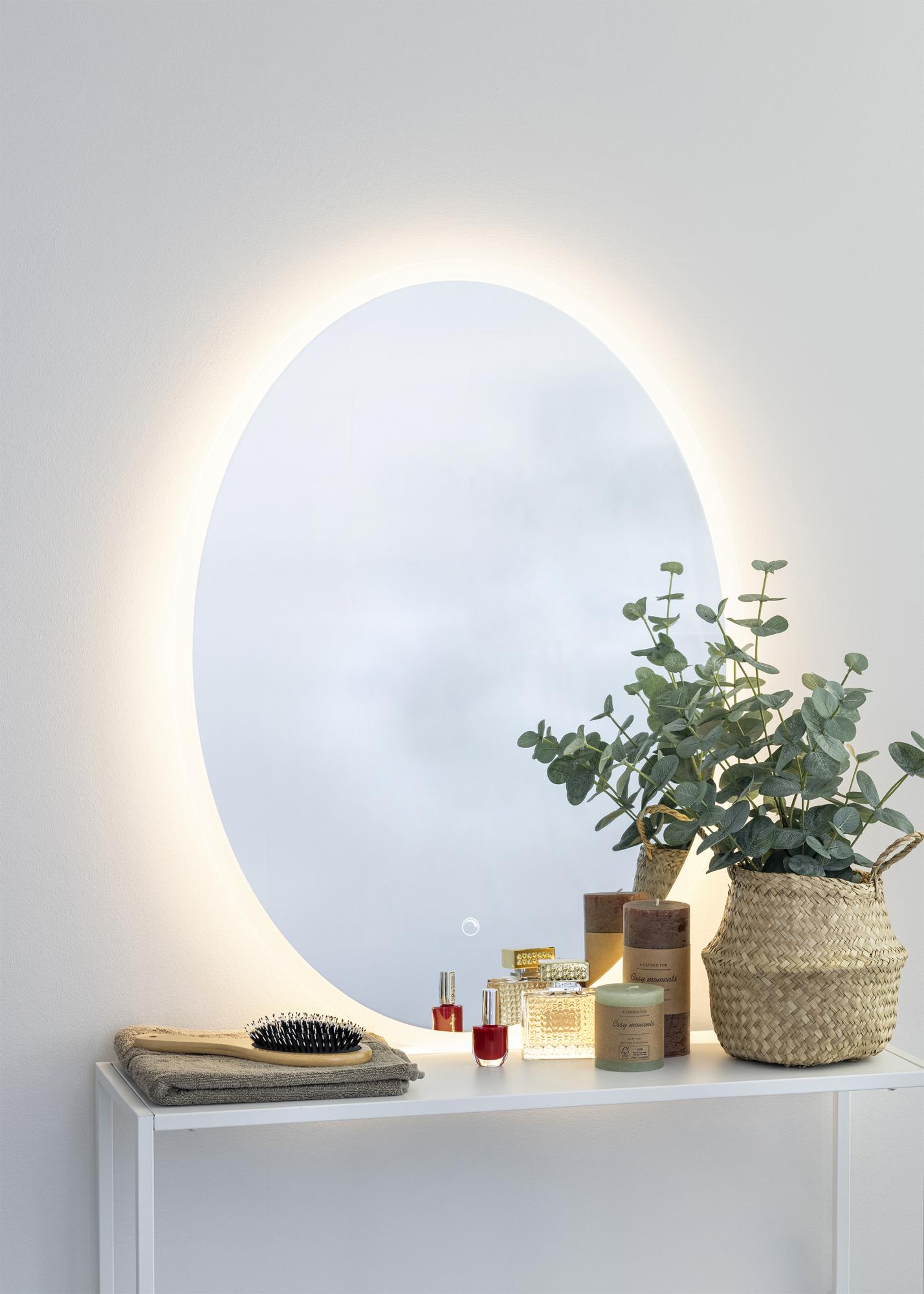 With its oval shape and integrated LED lighting, this really is a bathroom mirror with an elegant design! The integrated LED is dimmable, and can be adjusted by pressing the watertight touch button on the screen. The mirror is lit from behind by a warm, white 3000K light, which gives a beautiful glow at the front. LED is an energy efficient light source that makes for an even and natural light. The mirror is approved for bathroom use. This mirror is intended for fixed installation and for connecting to a light switch. For the mirror to function correctly, it must be connected to a standard switch, not a dimmer switch.