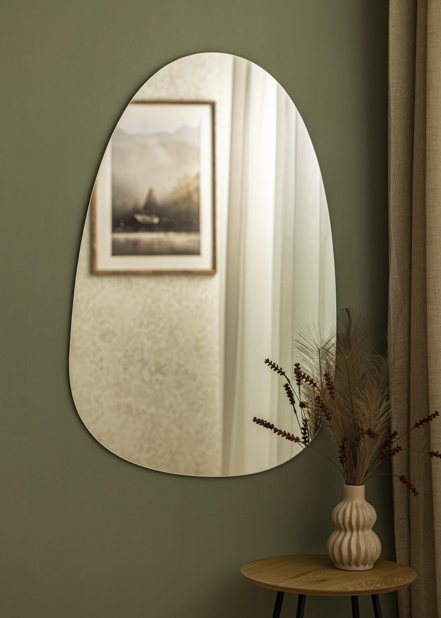 Experience the best of both worlds with this mirror: a trendy and eye-catching interior detail that is also elegant and stylish. The mirror is designed in a soft and asymmetrical oval shape that looks like an egg. The mirror is very thin and frameless, which adds to its modern and elegant feel.