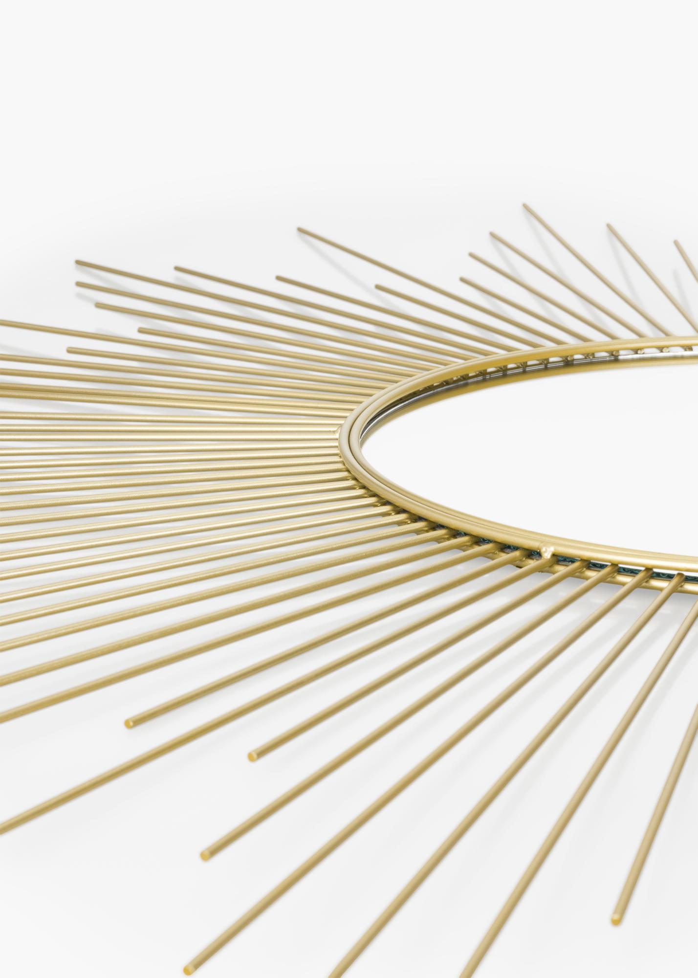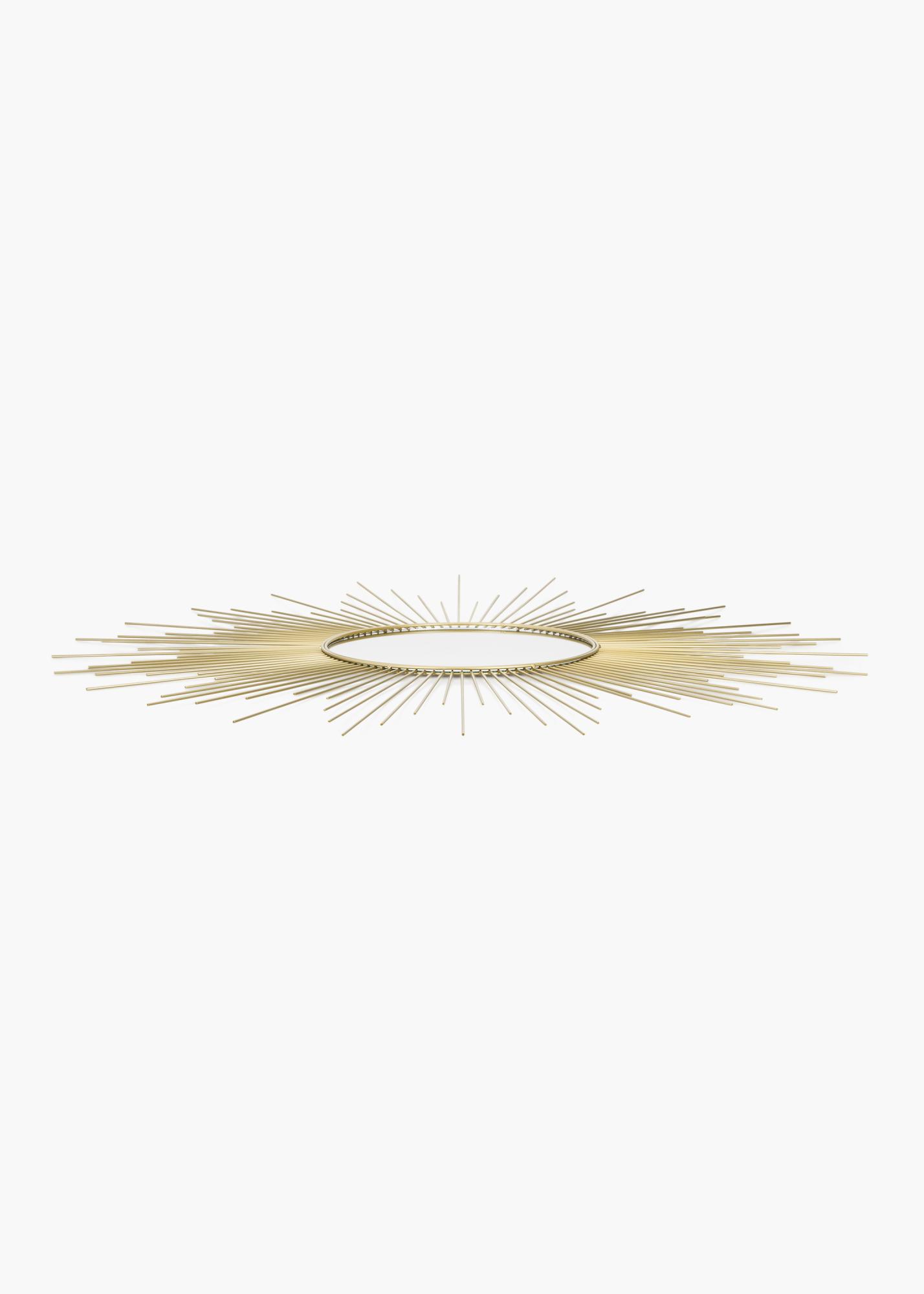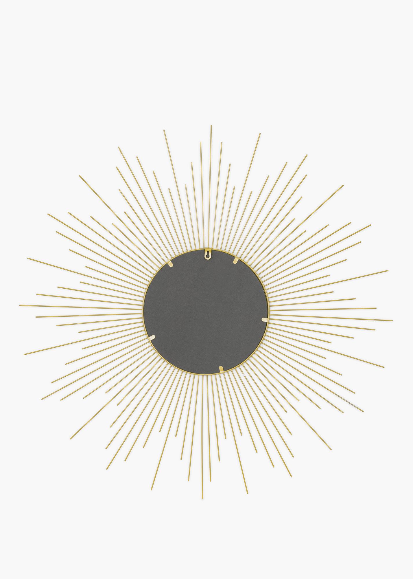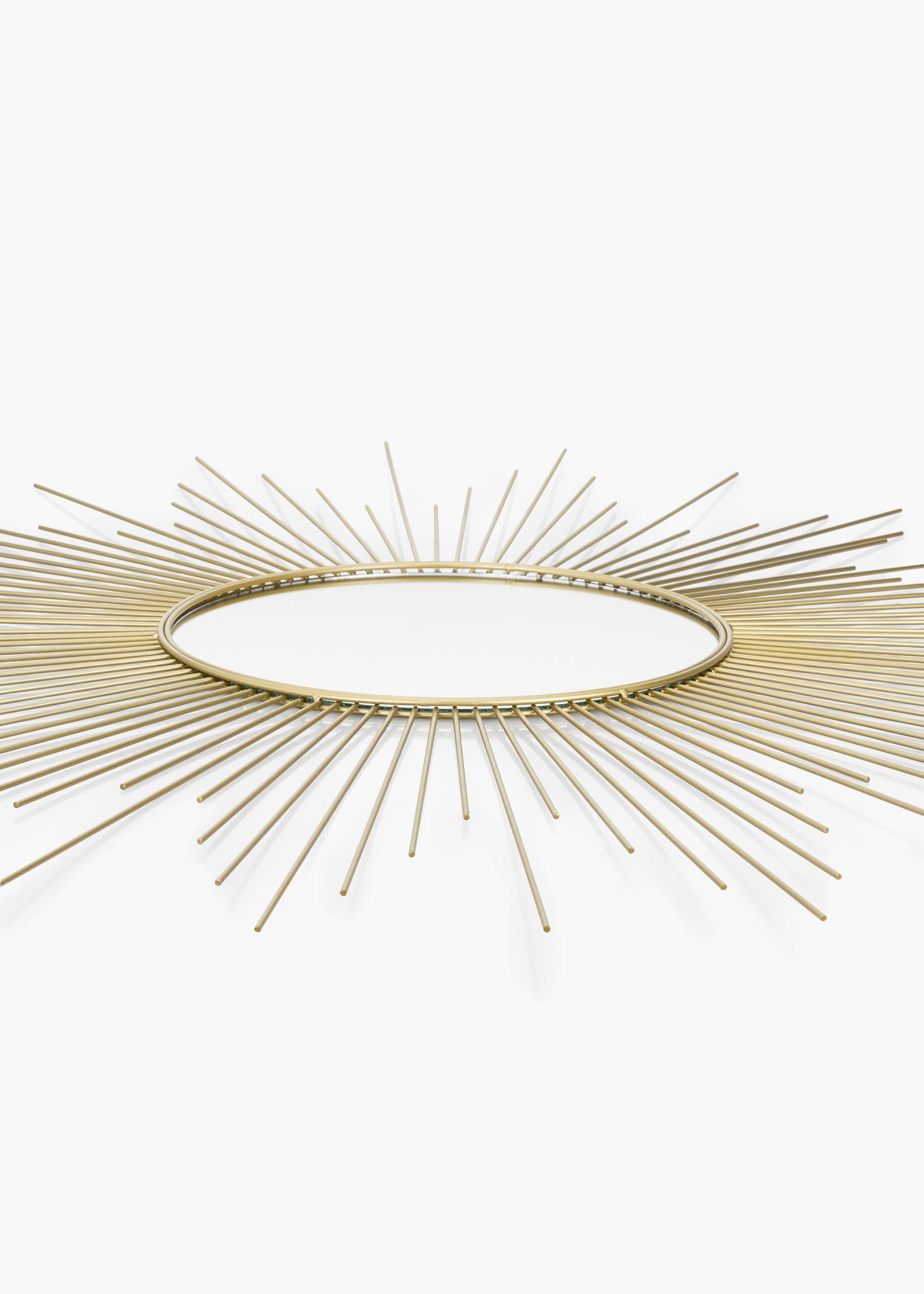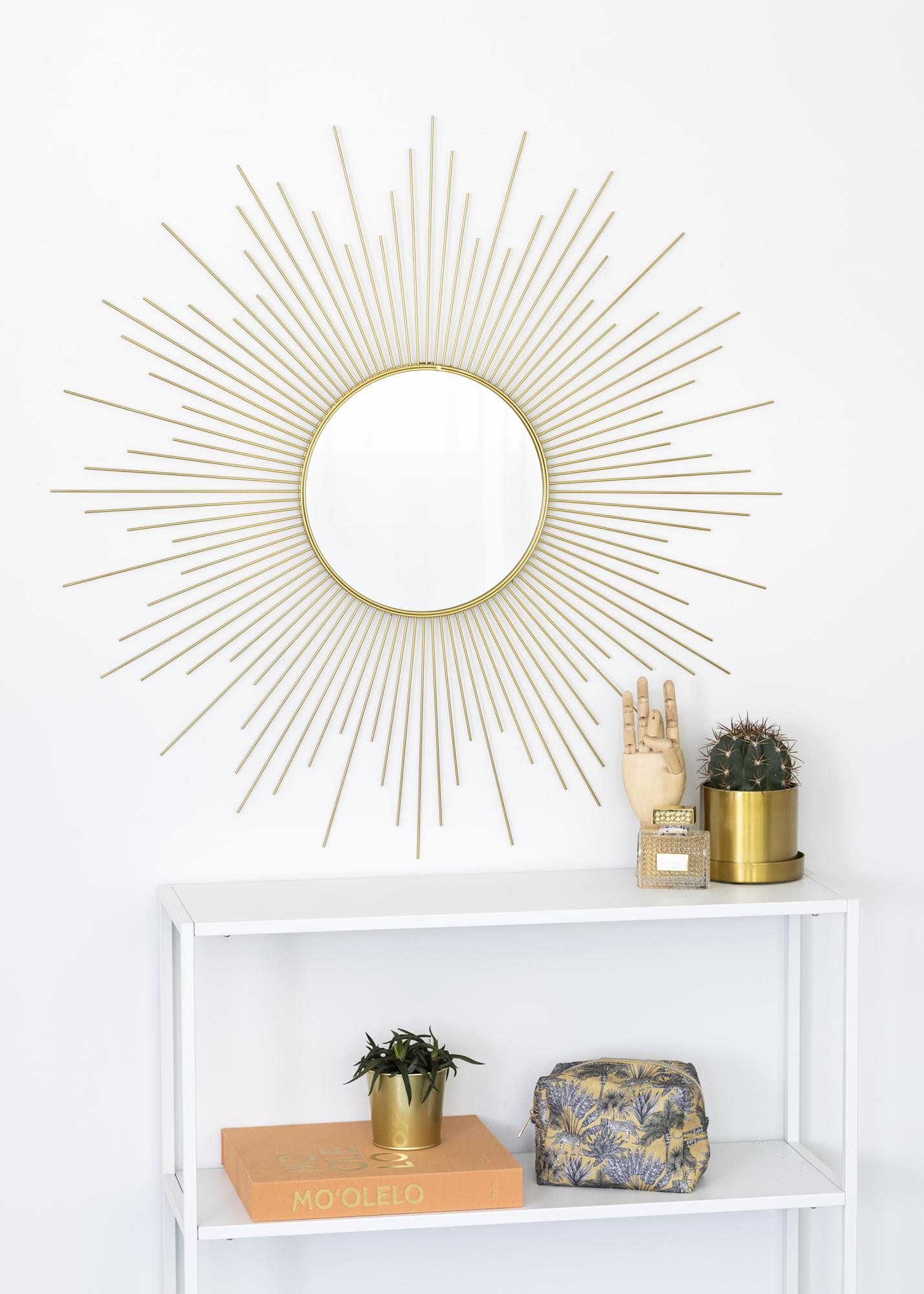This is a round wall mirror with a very decorative design. The mirror glass is framed by a star-like pattern with a beautiful gold colour. Make this beautiful mirror an eye-catching decorative detail in your home by putting it in a well-chosen place where its decorative nature will shine through. The mirror, which is made of metal, has an outer measurement of 90x90 cm.
