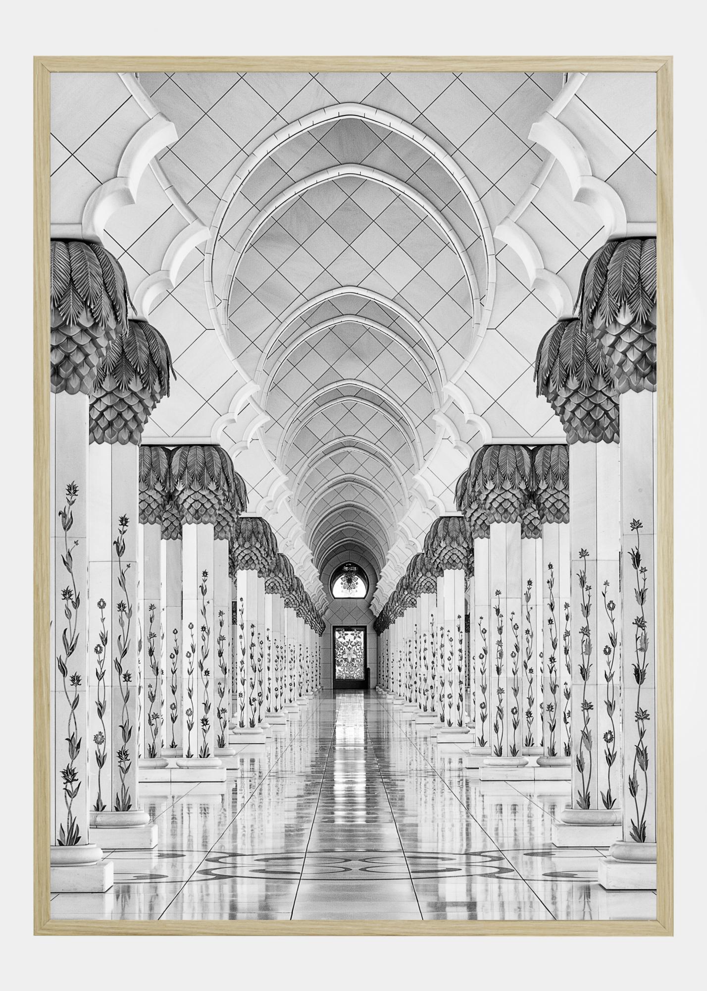 An black and white illustionist print showing deepth. Two rows of columns lead to a glass door in the distance. The columns are beautifully decorated with flowers. The natural light shines in through the glass door to create a reflection of light on the floor. Hang this print to create a feeling of space.
