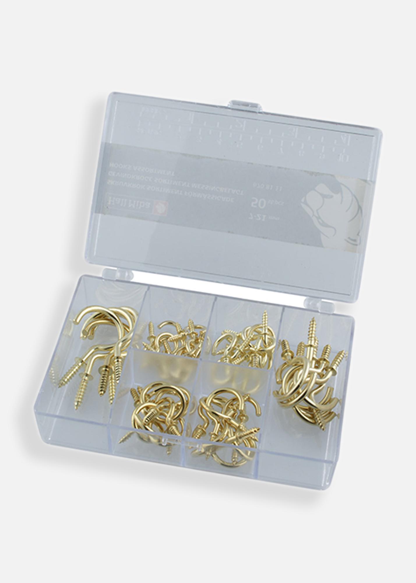 This hook assortment contains 50 brass-plated hooks in sizes between 7–21 mm. Perfect for various types of hangings in the home, whether it be pictures, decorations, or other small details. A practical set for those who want a smooth and stylish mounting option.