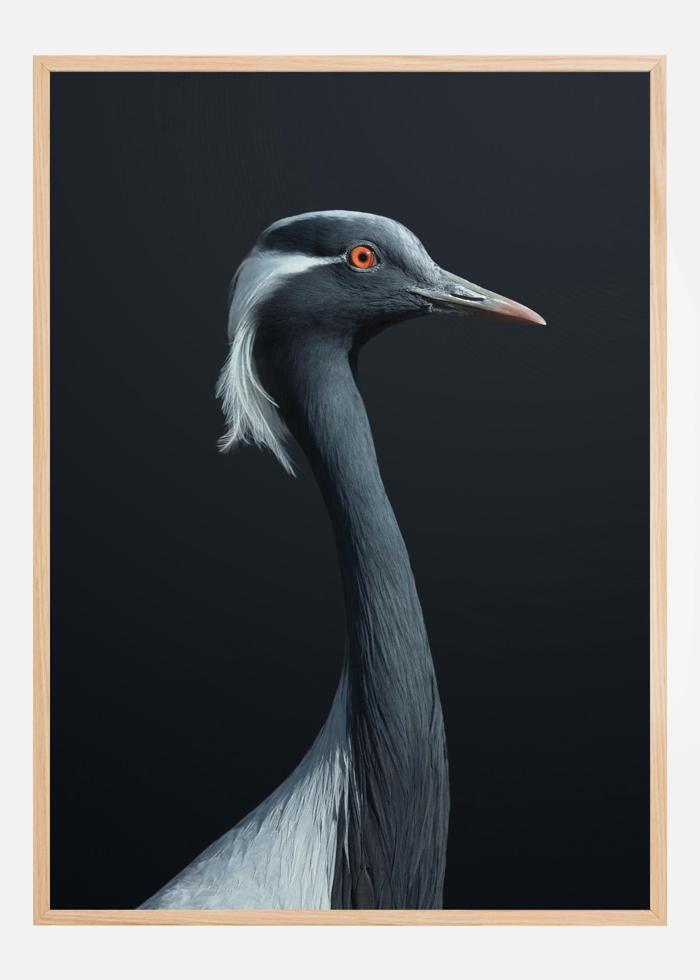 A close-up picture of a long necked black and white bird. The bird's beautiful black coat leads to a white body which also matches its crown. An impressive image of a black and white bird on a grey background with its orange and black eye staring to the right. A perfect print for a bird lover.