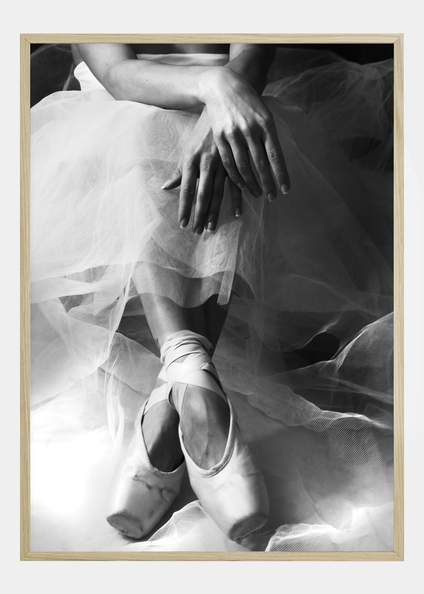 An elegant poster of a ballerina posing sitting before a dance. Follow the crossed feet and hands as she waits here turn. This poster is the perfect addition to a neutral wall.