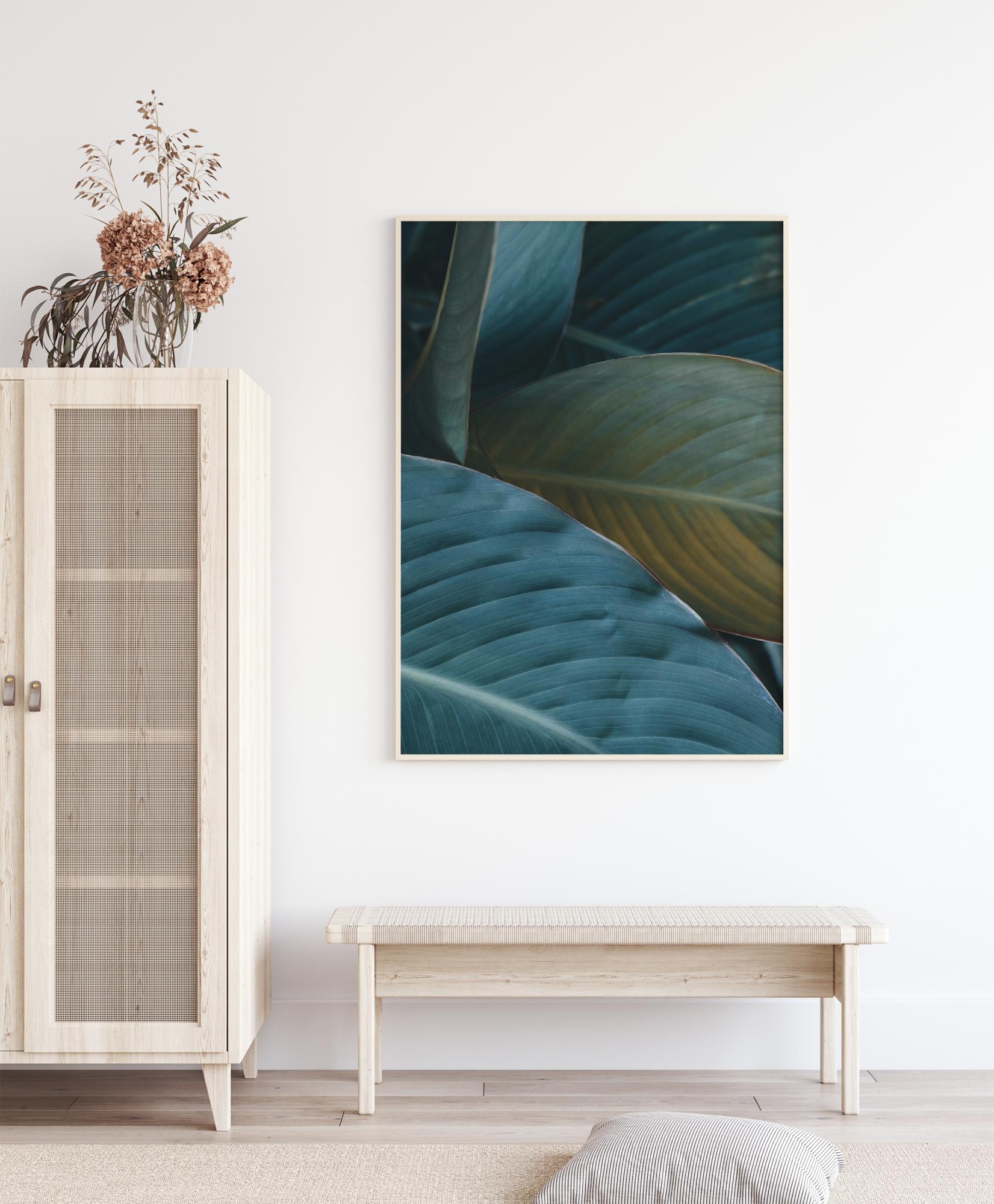 A close-up print of leaves. The simplicity of this print is reflected in the different tones of green represented. The leaves are lighter towards the centre. The natural light shines on the borders giving the leaf a gold lining look. A beautiful print to hang in a room full of plants.