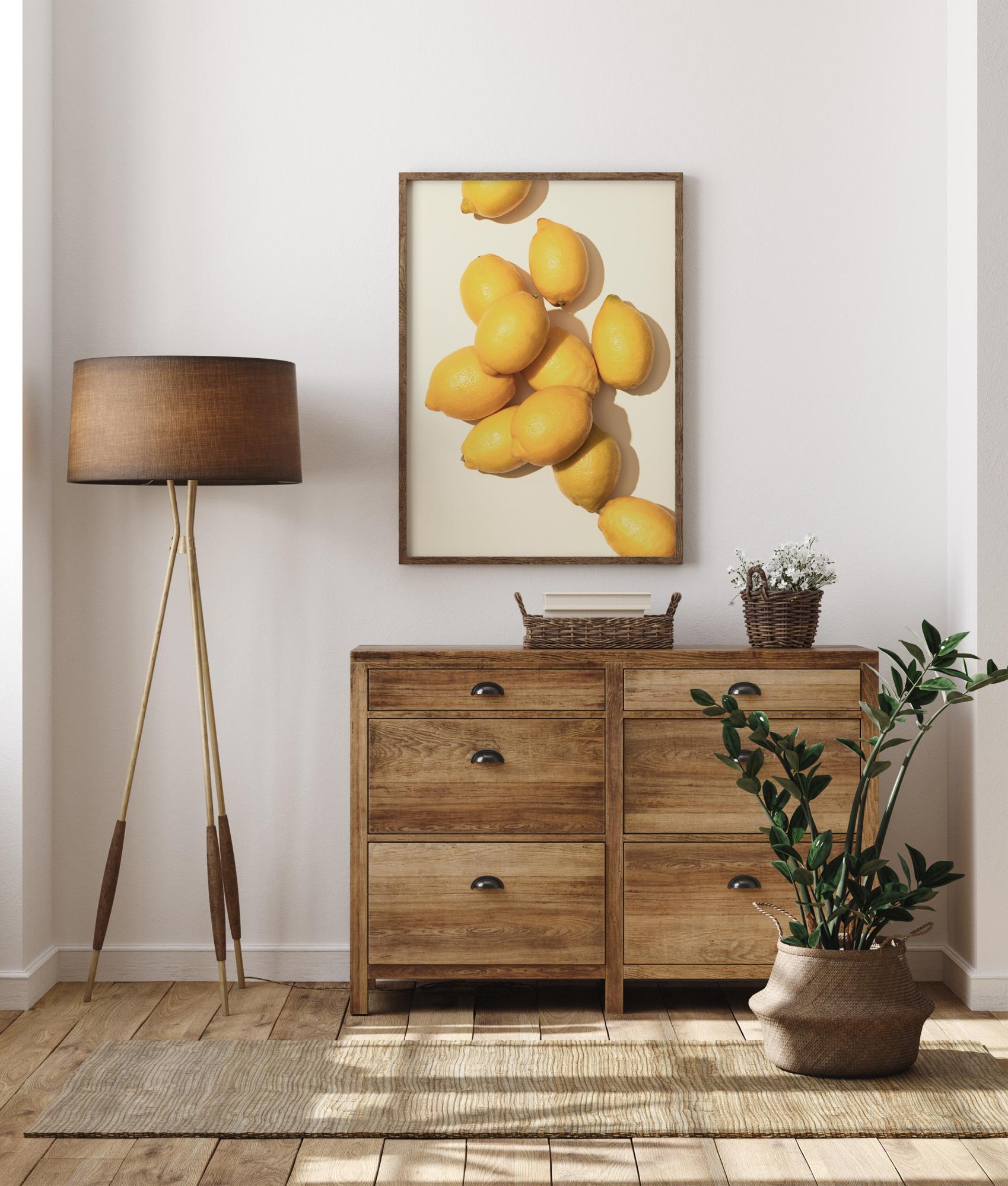 A realist image of a grove of lemons. The light from above is projected directly onto the fruit which highlights the roughness of the peel. The light creates shadows that extend over the white background. Smell the freshness of this citrus fruit when you hang this print in your kitchen.