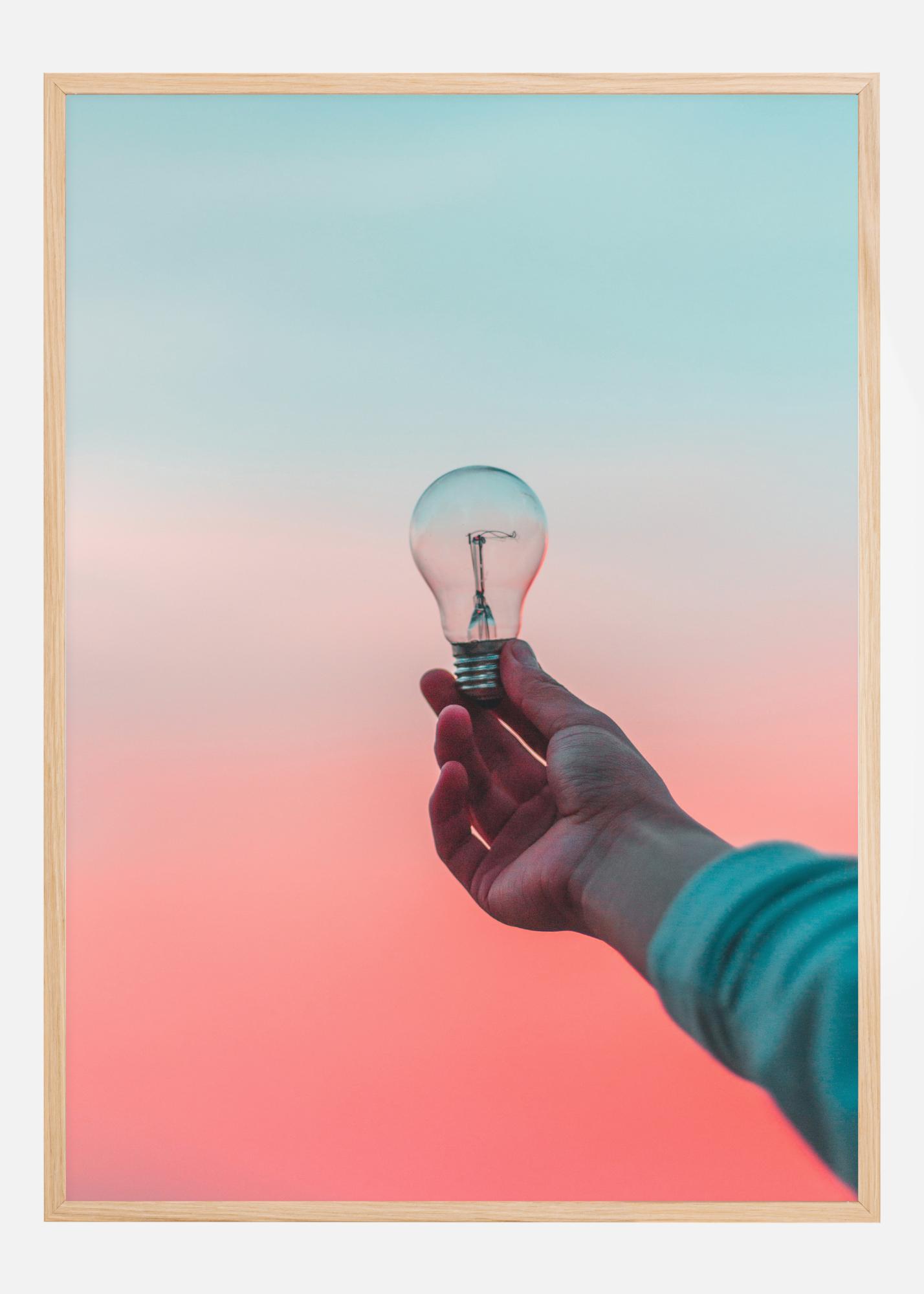 A simple print of lightbulb held towards the sky. The beautiful pale blue sky enhances the turquoise jumper of the person holding the lightbulb. The lower part of the prints reflects a beautiful pink tone that is reflected in the lightbulb. A soothing print that would look beautiful hung against a pastel coloured wall.