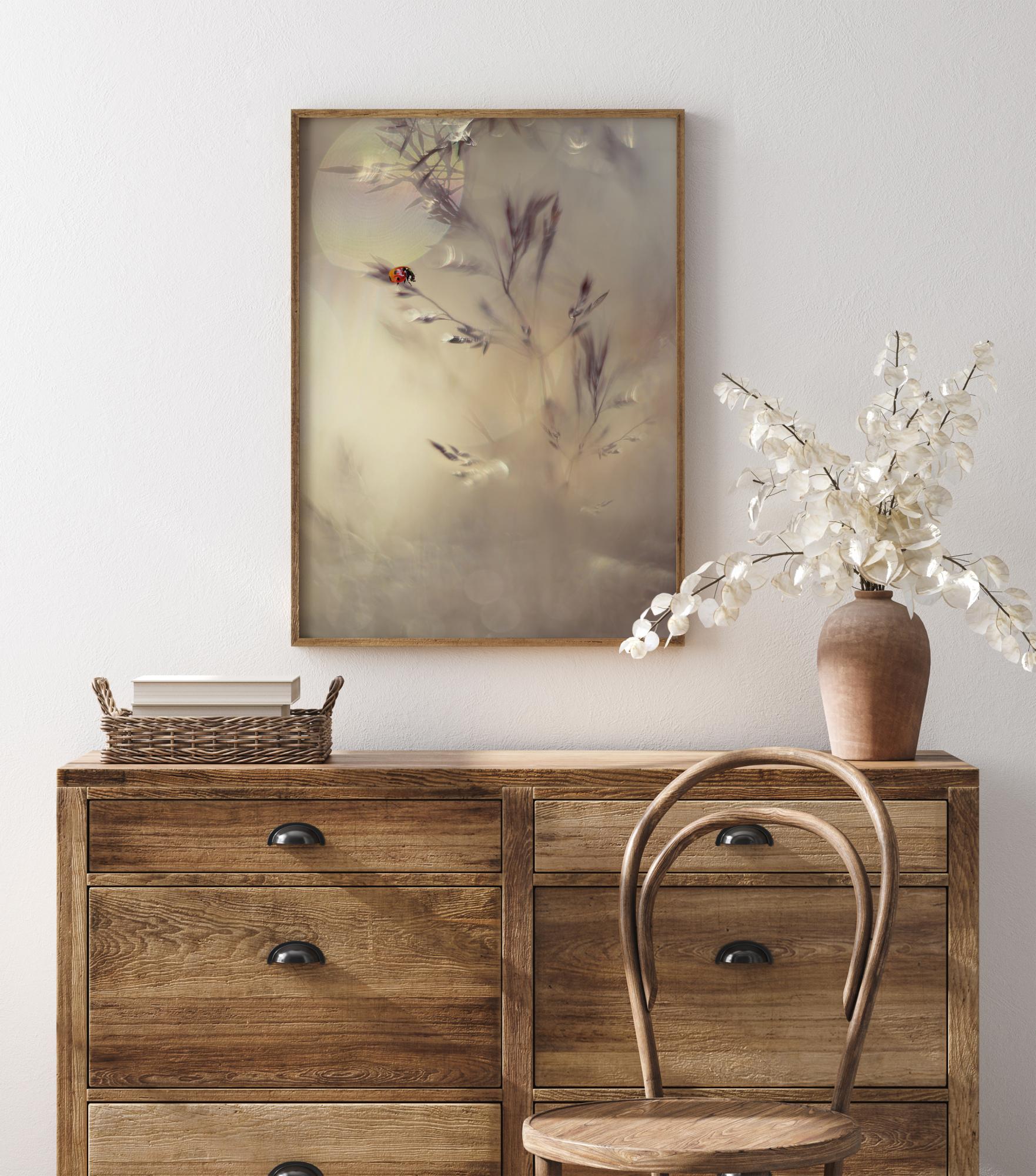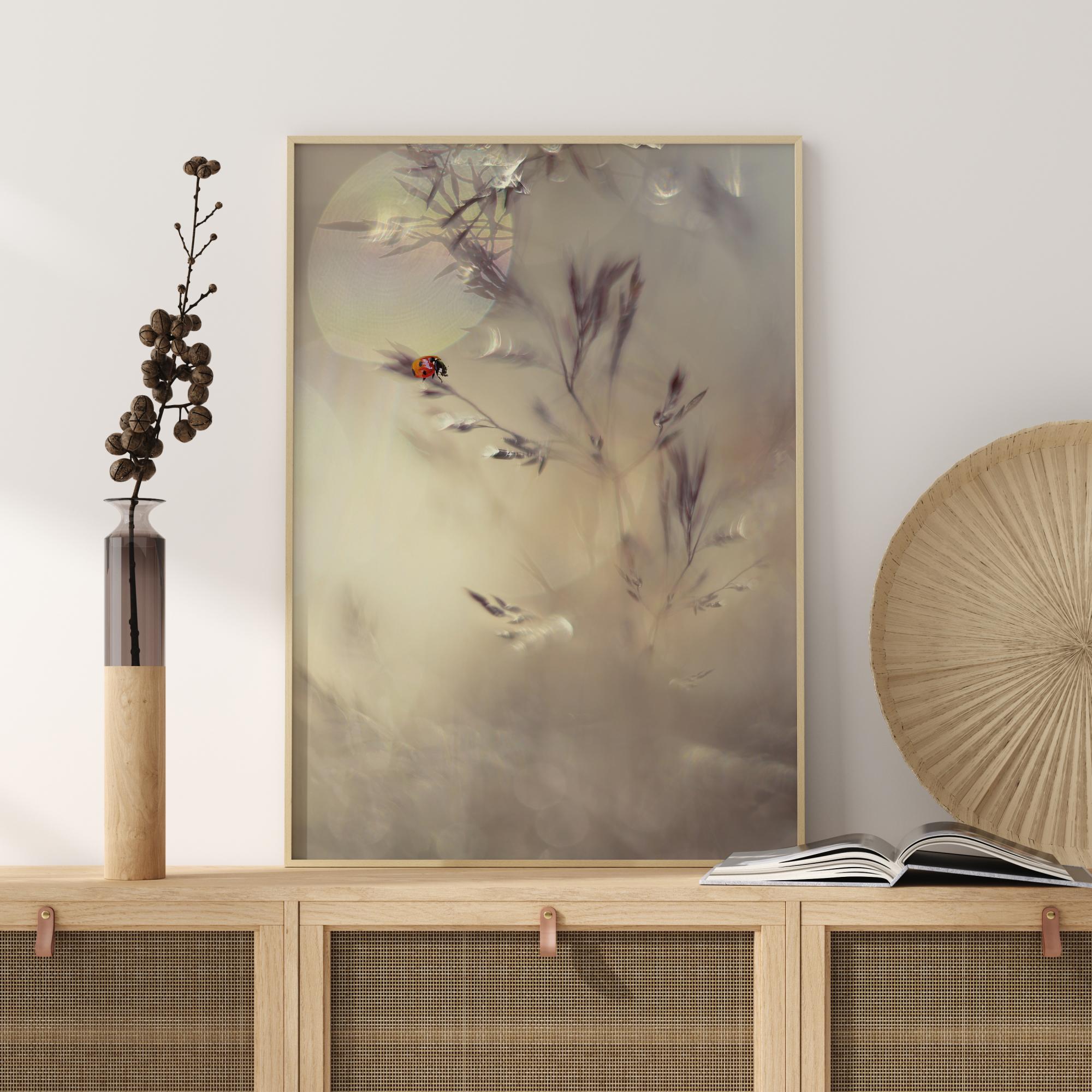 A misty image of a beautiful ladybird on a dried grass. With the sunlight reflecting in the distance, the ladybird's bright black and red colours stand out significantly. The beautiful misty colours transmit a sense of peace and tranquillity. A beautiful print to hang in a bedroom.