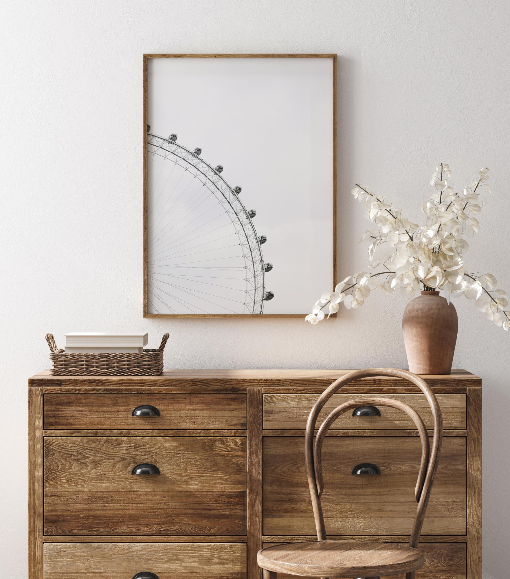 An impressive black and white print of the London Eye. With the grey London sky in the background, the spokes of the wheel lead the eye to the nine passenger cabins. A truly impressive print highlighting this magnificent engineering structure. Imagine the view from one of these cabins.