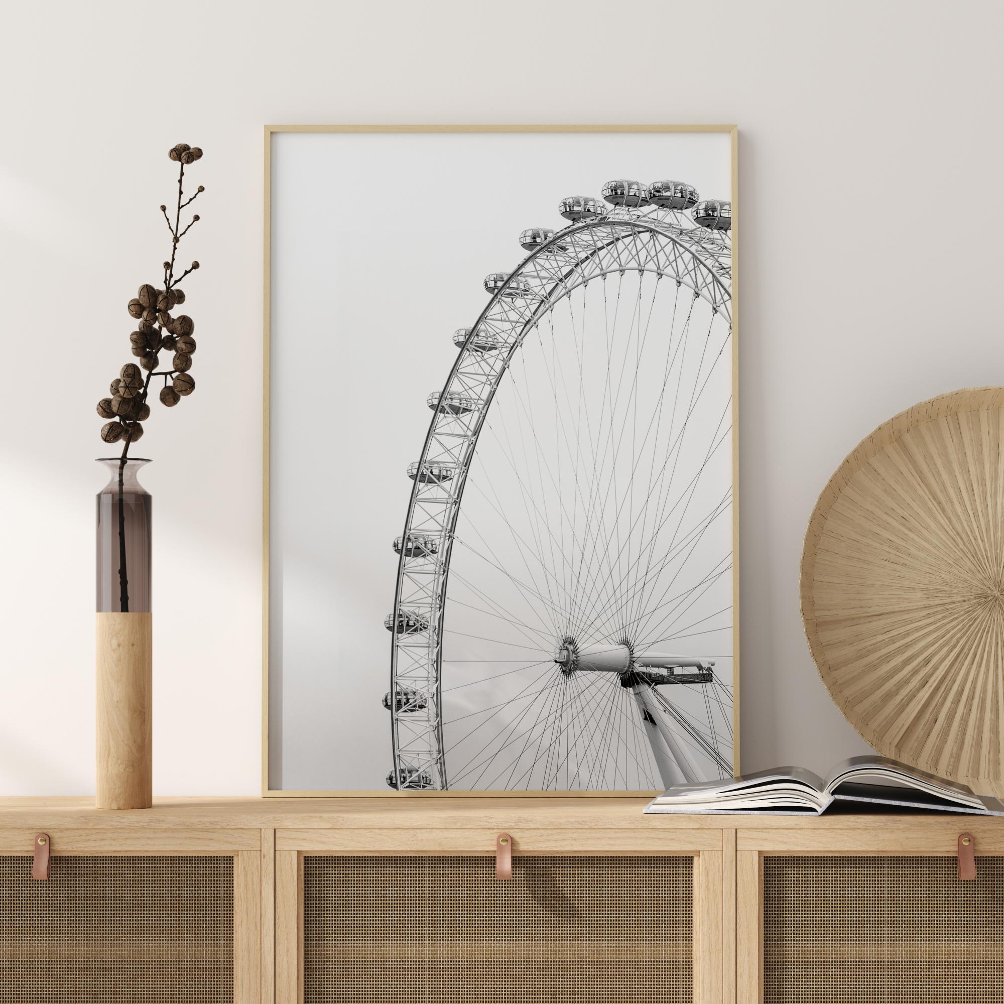 A breath-taking print of the London Eye. With the grey skyline, the black frame of the London Eye takes your eyes to passenger cabins perched on the edge of a wheel. An impressive print highlighting the size of the wheel. A beautiful print to create a feeling of immensity.