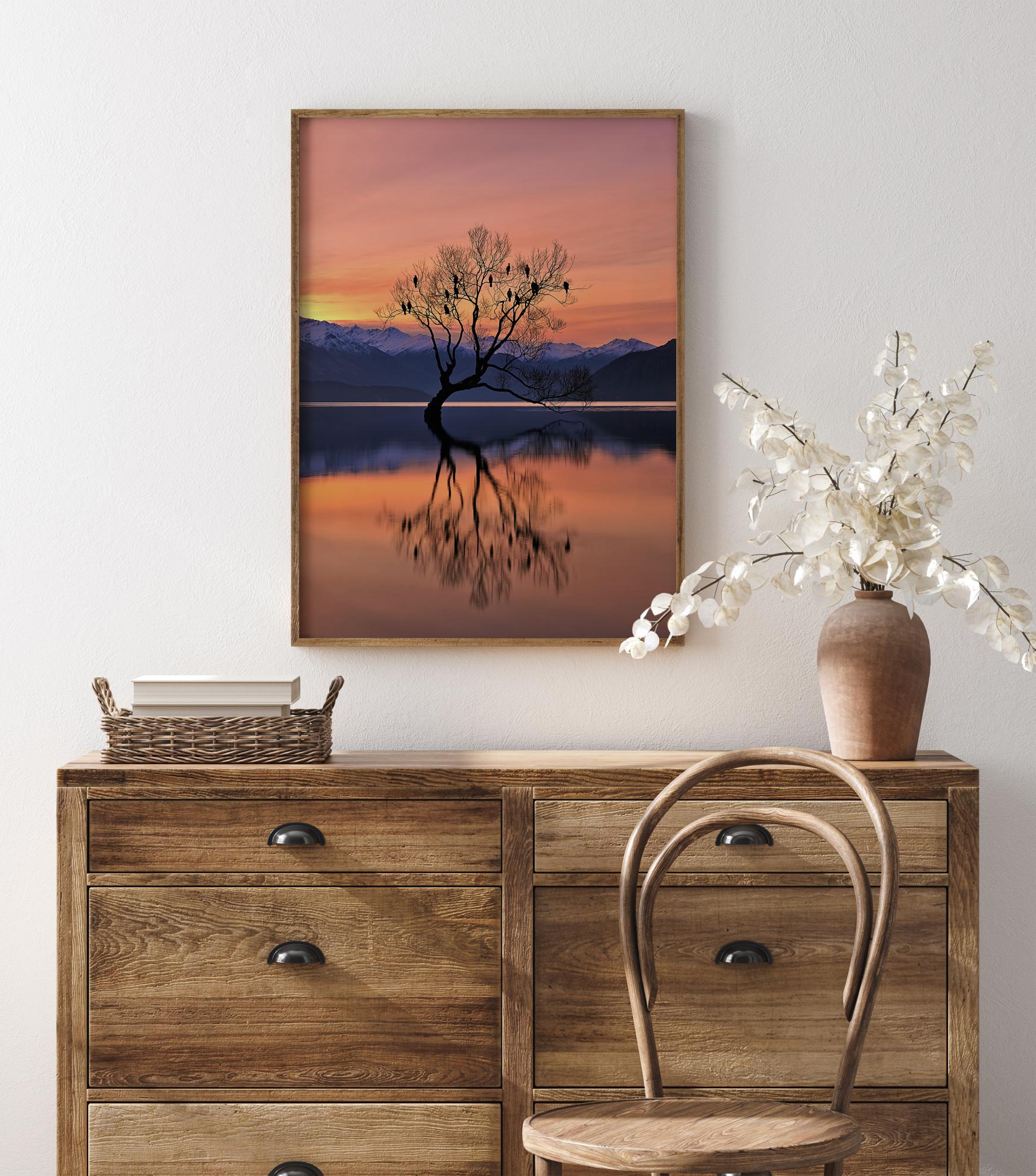 A beautiful nature print of a lone tree in the middle of a lake. With the birds perched peacefully on the branches, this pastel print reflects the tree in the lake creating a perfect mirror effect of both the nature and the colours. Hear the silence in this soothing print.