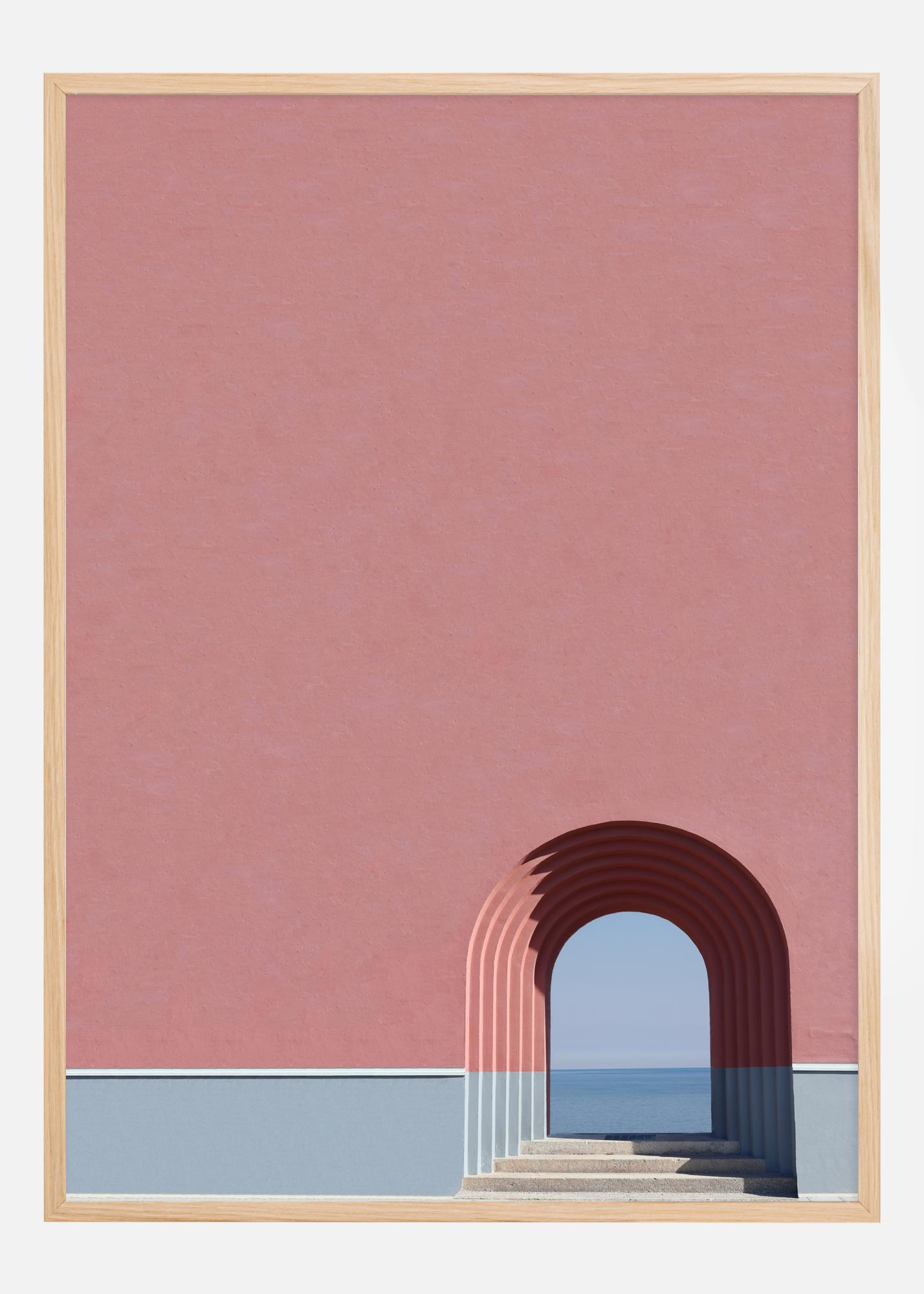 This poster titled "Look the Ocean" invites contemplation through its simple and clean design. The image highlights a serene architectural arch opening up to the endless horizon of the sea. The motif plays with the contrast between the soft pink hue of the wall and the calm blue sea, creating a peaceful and harmonious feeling.