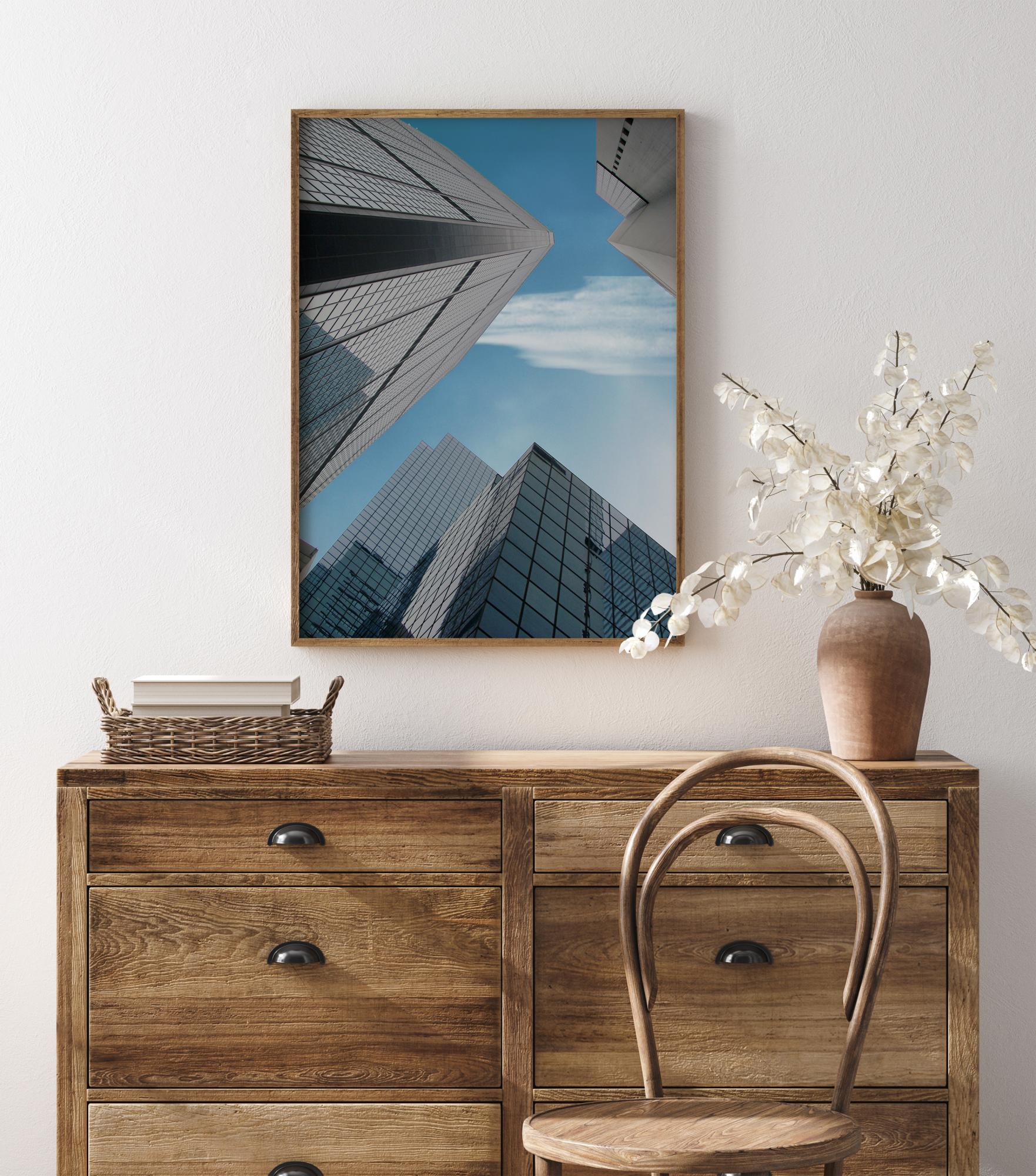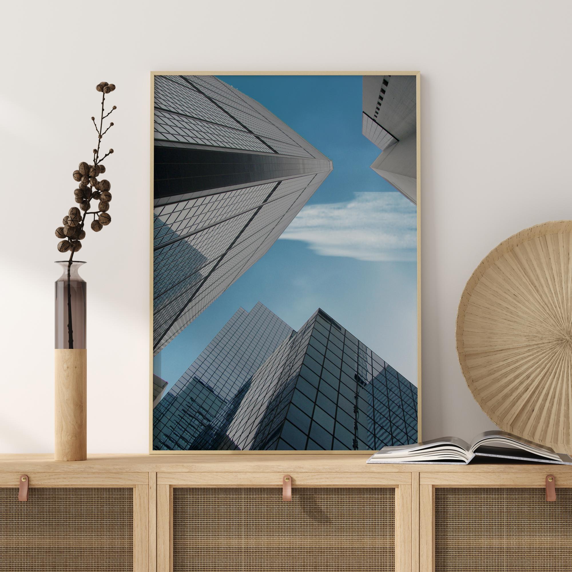 A breath-taking architectural print of mirror panelled buildings. Taken from a bottom-up perspective, this print gives a feeling of grandeur. The beautiful, light-blue sky with a single white cloud adds that extra touch of colour to this beautiful print. Perfect in a small ambient to add a sense of immensity to a small room.