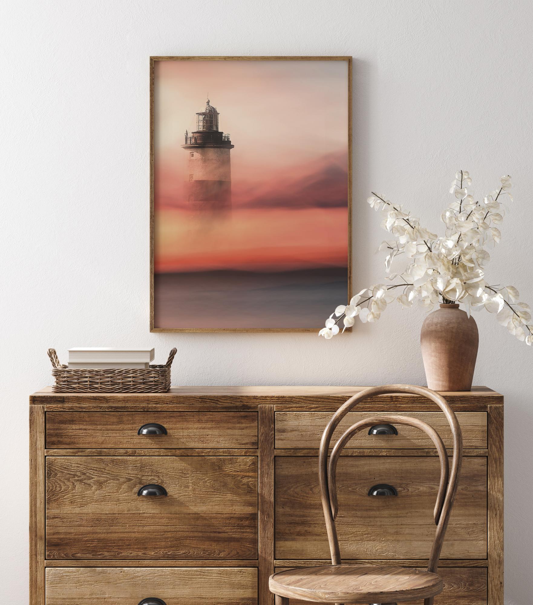 A beautiful romantic print of a lighthouse in the sea mist. The soft, pink pastel colours create a feeling of romanticism, while the soft blue coloured sea adds a darker tone to this beautiful print. Feel and hear the sea breeze when you hang this print in your home.