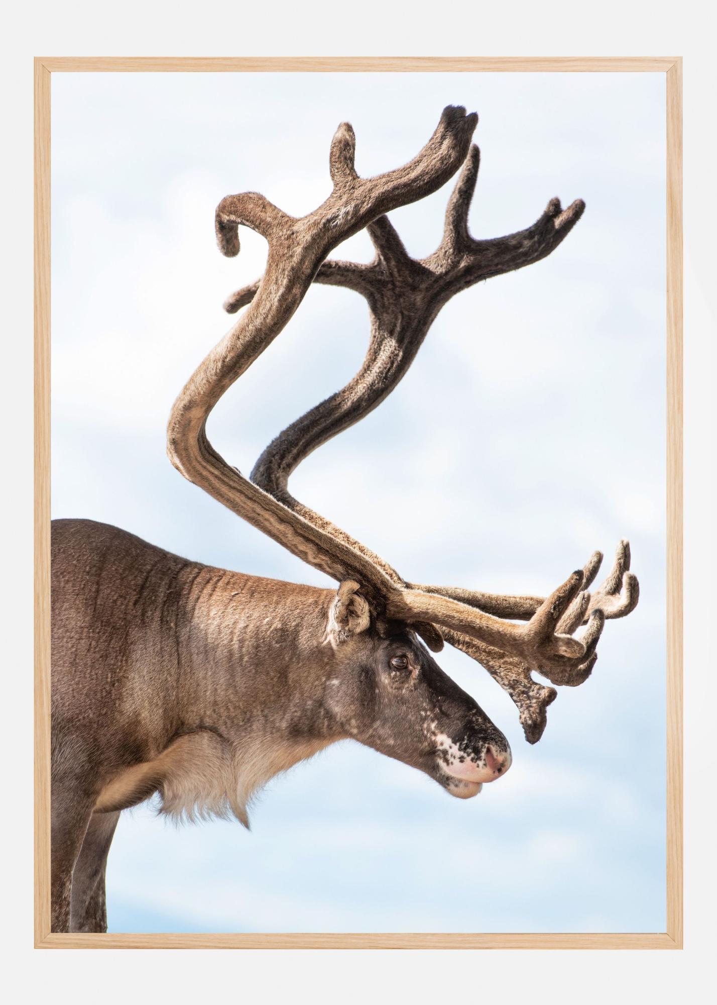 The colour palette of this print is harmonious and earthy, with shades of brown, dark brown, beige, and creamy White in the reindeer's fur and antlers, combined with a light background in White and soft light blue. The natural colours make the poster easy to match with different interior styles, and it works just as well on its own as it does together with other posters in a gallery wall.