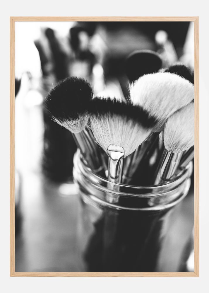 An artistic yet fun print of a glass jar full of make-up brushes. This striking black and white image shows a variety of brush sizes. Feel the softness of these brushes when you hang this print on your bedroom wall.