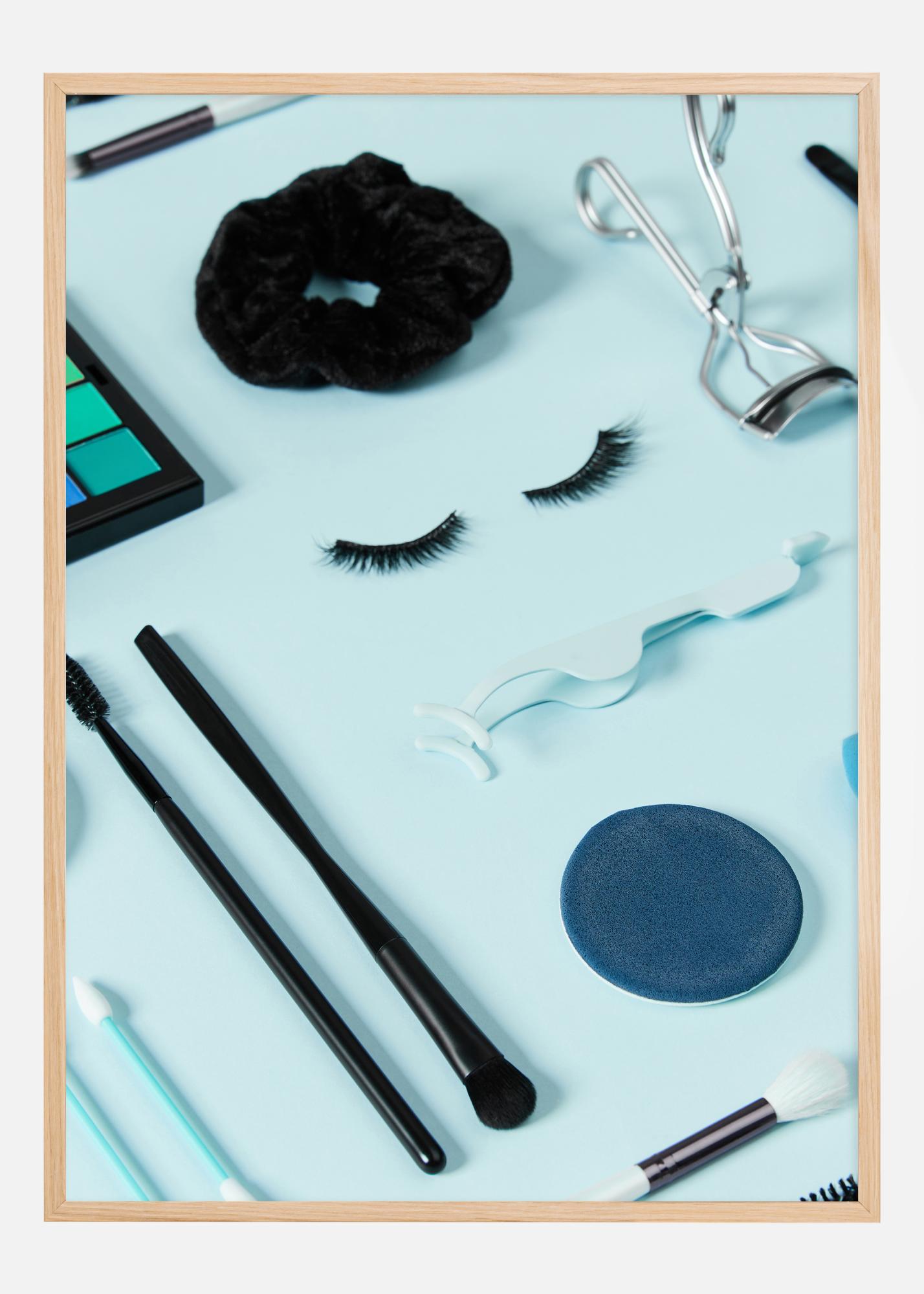 The color palette is dominated by soft and calming blue shades complemented by black and silver, providing a fresh and contemporary look. The realistic details of the makeup brushes, eyelash curler, and false eyelashes beautifully contrast against the minimalist background, and the texture of the black hair tie adds an interesting visual element. This print will be an excellent addition to the bathroom, makeup table, or any place where beauty and style are paramount. It is perfect for inspiring and enhancing your daily beauty ritual.