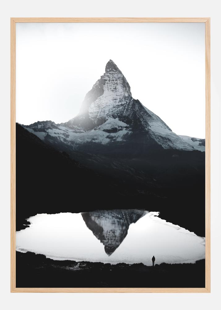 This stunning black and white image features the peak of Matterhorn piercing the morning sky. The sun's rays eclipse the mountain's jagged slope as a man stare on. The reflection of the scene is captured in the lake at the bottom of the scene. Hear the silence as you hung this print in your lounge.