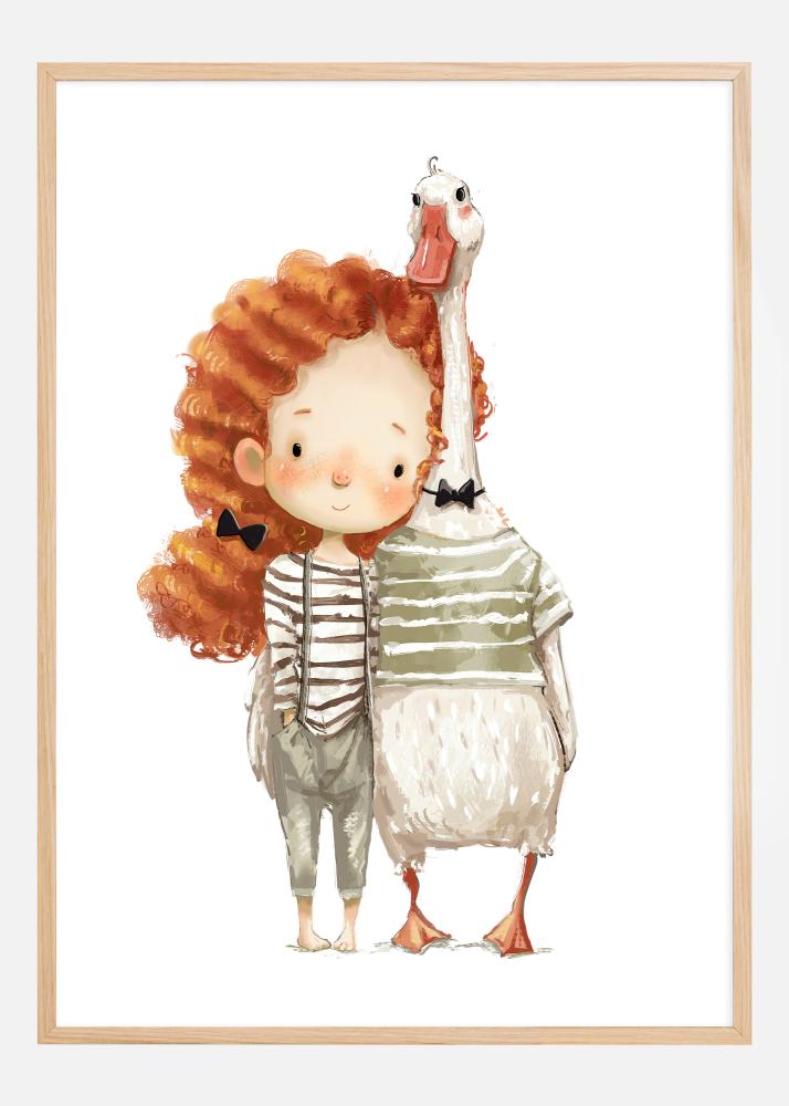 This playful and heartwarming poster depicts a young girl with vibrant red curls standing next to her faithful companion, a large duck. They share a tender and joyful moment together, captured in the soft, warm tones of the watercolor painting. The charming duo, with the girl's rosy cheeks and the duck's curious gaze, radiates friendship and joy.