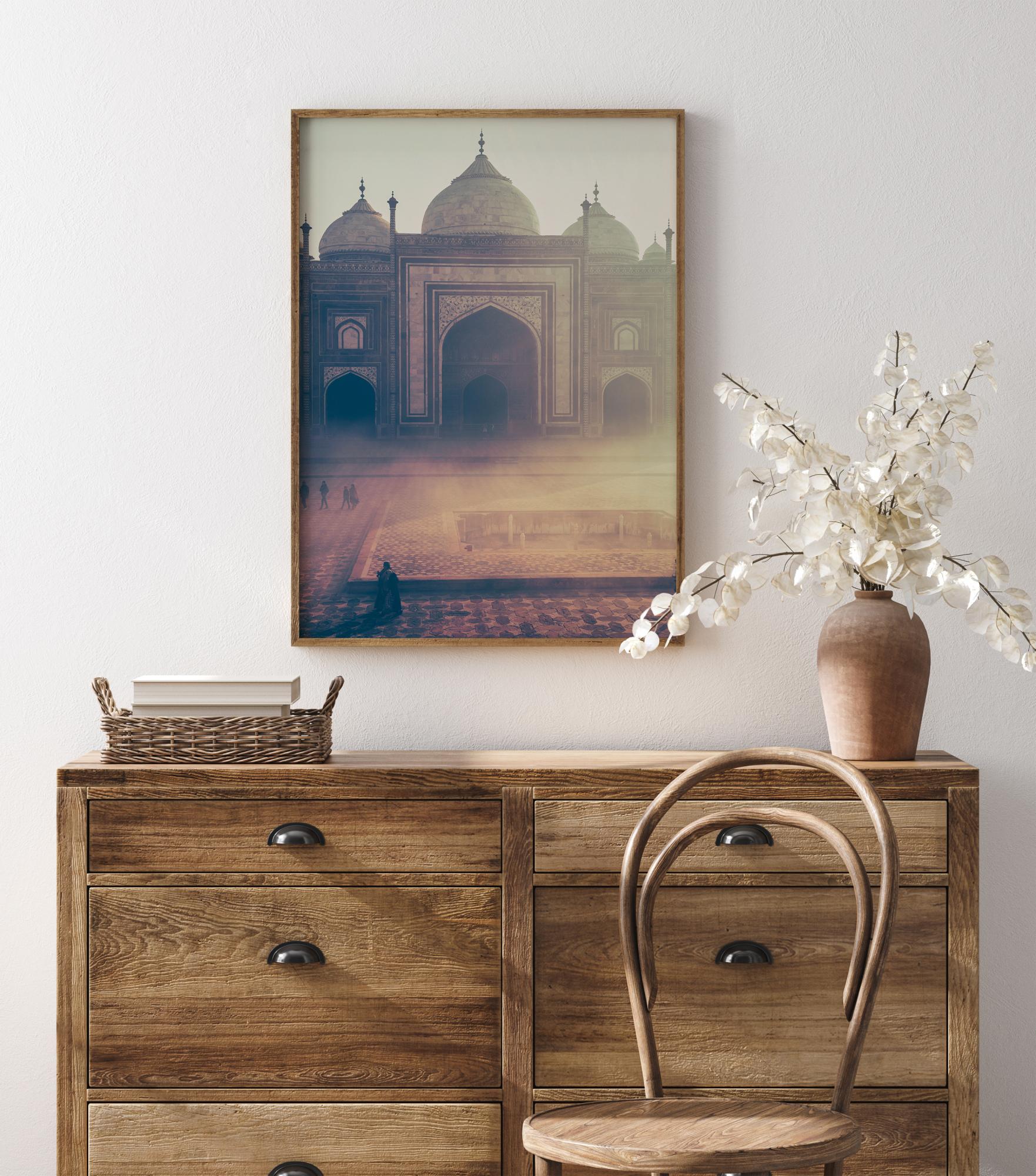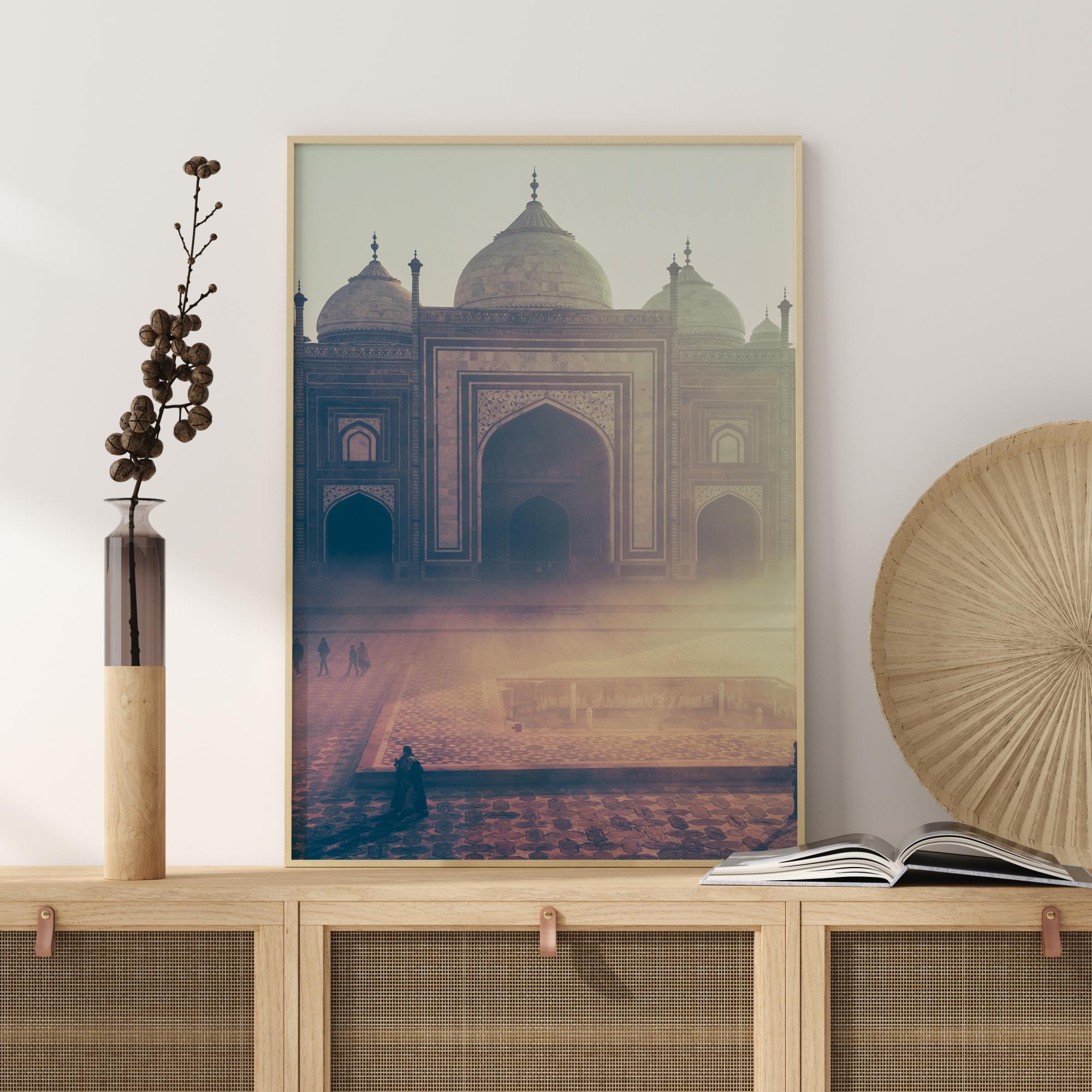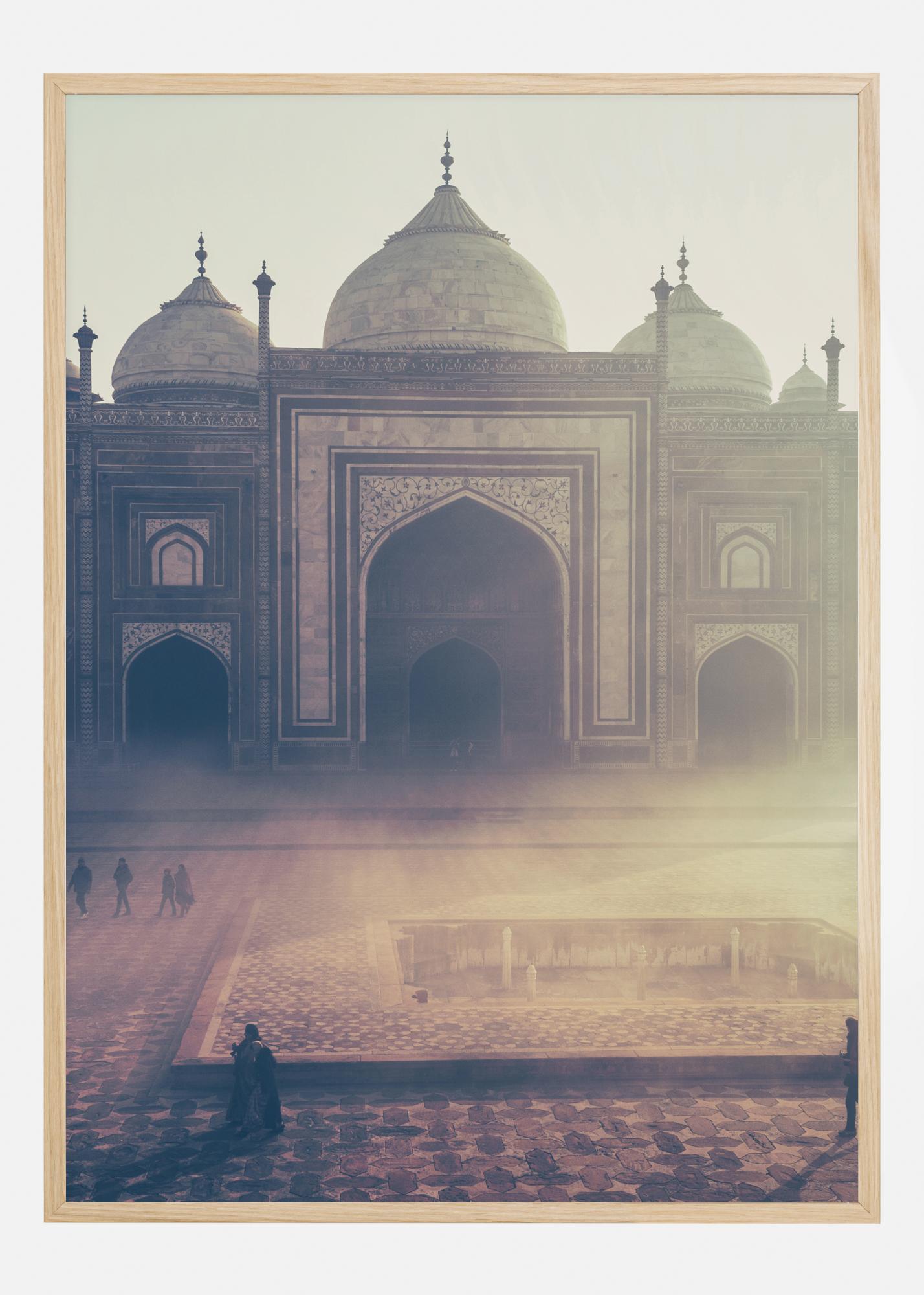 The spiritual centre of the Muslim world stands assertively above the square in the foreground. A small group of people roam the square through a brightly illuminated lingering fog. The largest of the entrances to the mosque is flanked by smaller ones on both its left and right. A peaceful print to create a soothing atmosphere.