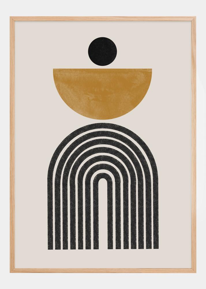 Immerse yourself in a world of abstraction and symmetry with our modern poster depicting a series of black and white arches under a sun-shaped gold-colored semicircle, topped by a black circle. This print is an ode to the clarity of modern art and the simplicity of geometric design, adding a sophisticated touch to your decor. The colors are boldly reduced to highlight the contrast and visual weight of each shape.