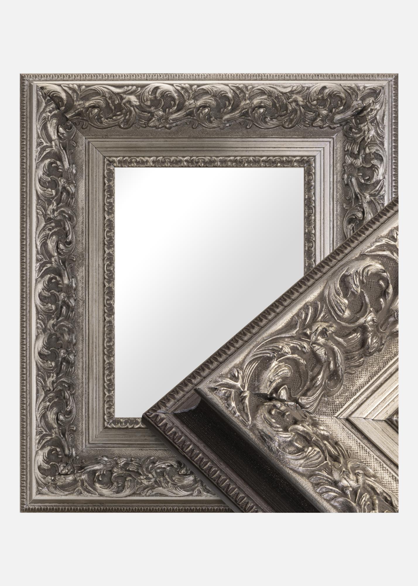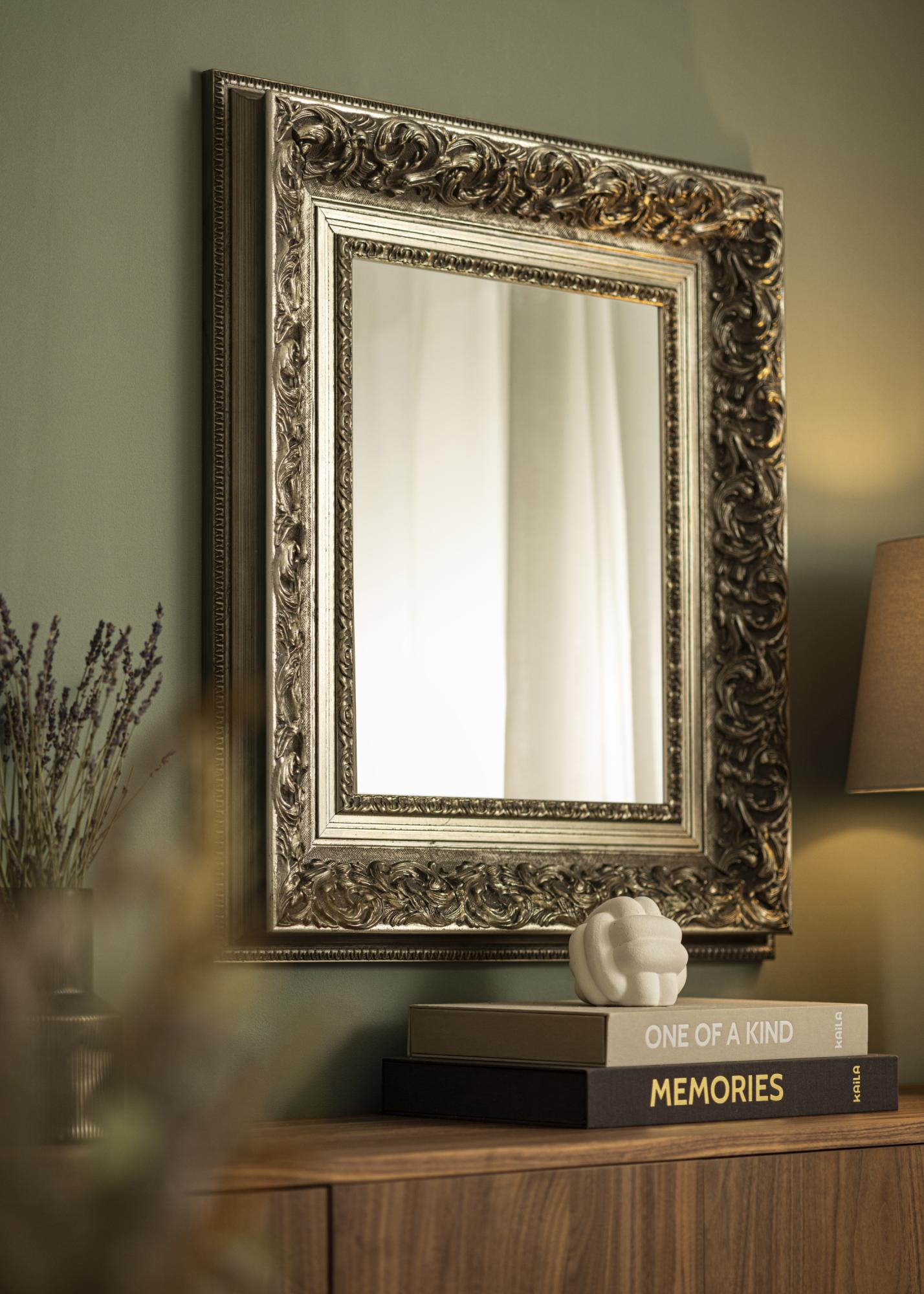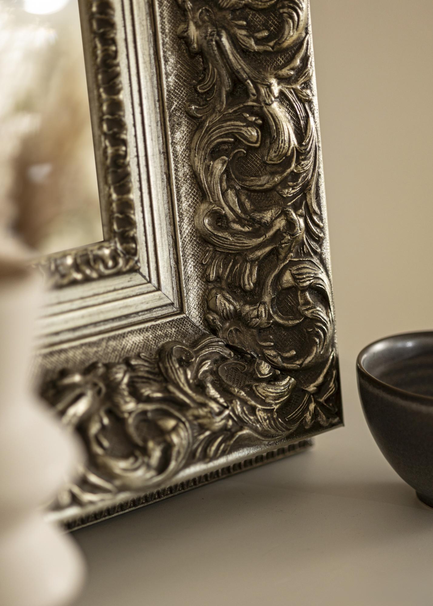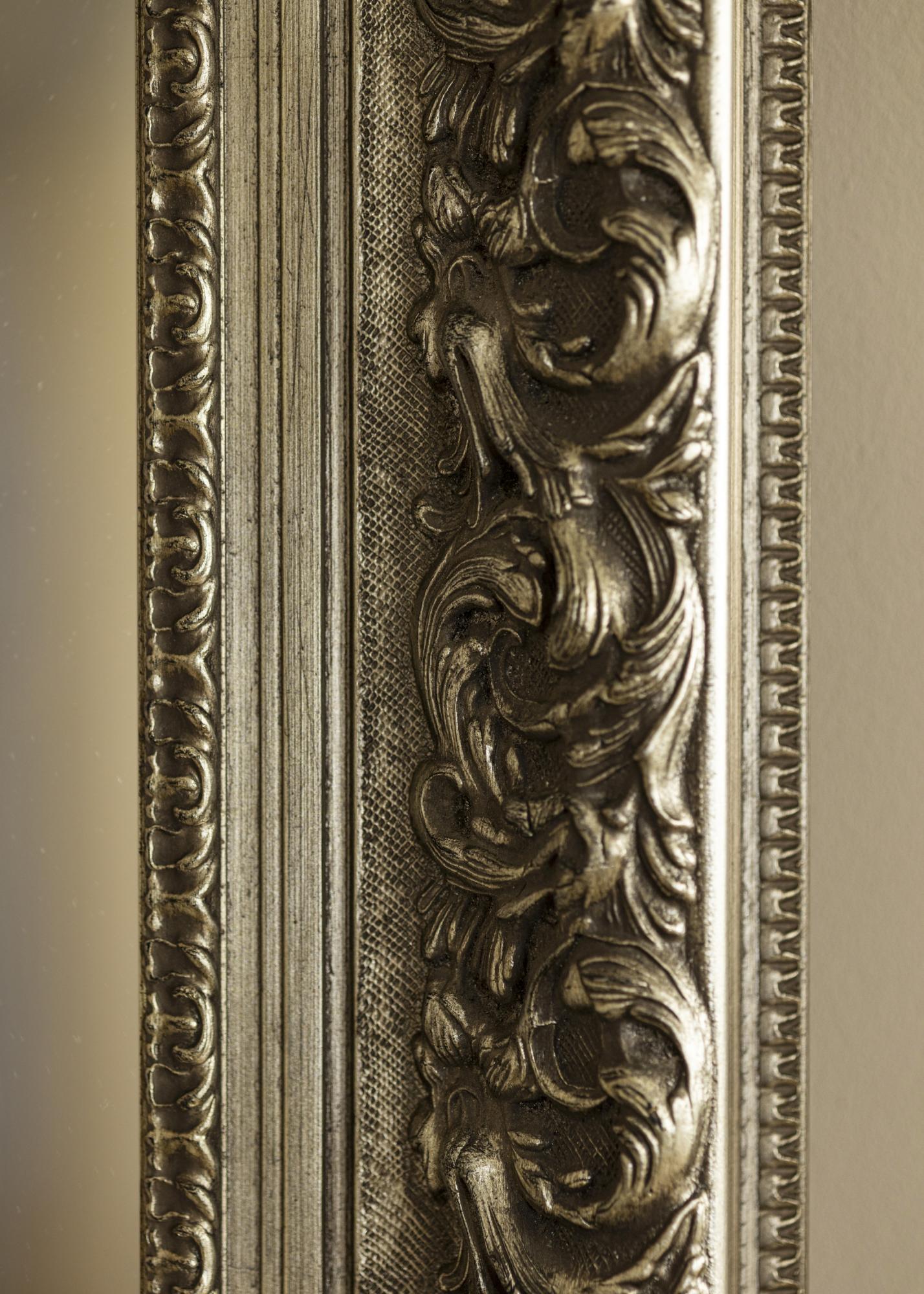 Mirror Birmingham Silver is a custom-made mirror manufactured by us, which gives you the opportunity to get it in exactly the measurements you desire. With its impressive 152 mm wide frame list and a depth of 74 mm, this mirror becomes an eye-catching detail in any room where it is placed. The frame is made of pine and has a richly ornamented design in antique silver, which gives the mirror a unique character.