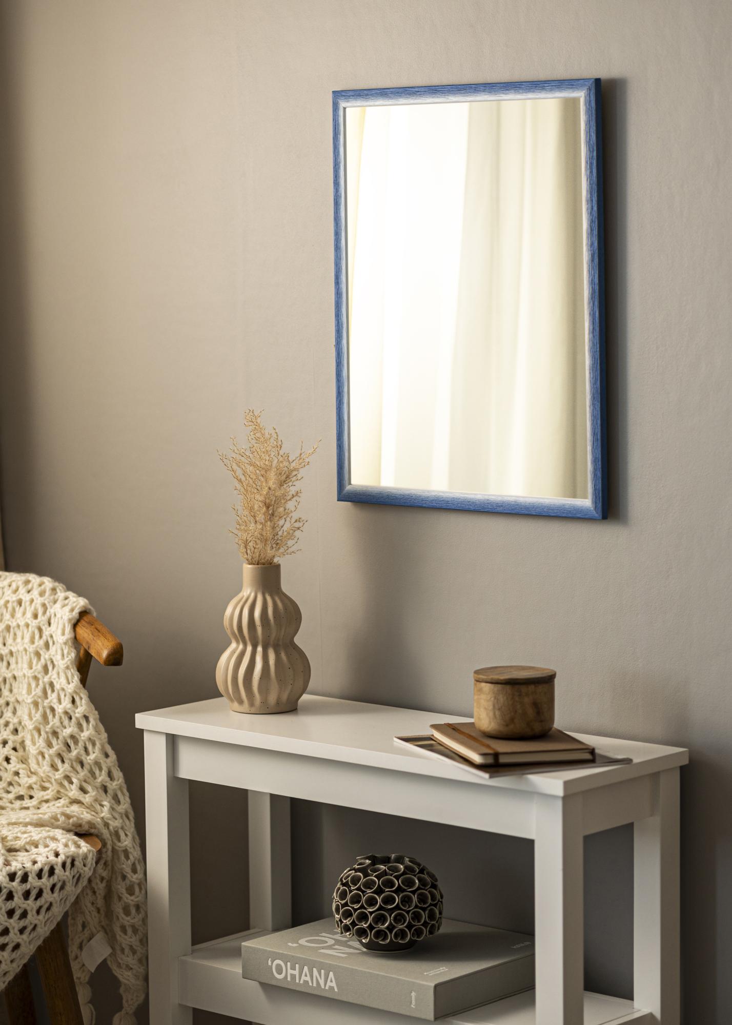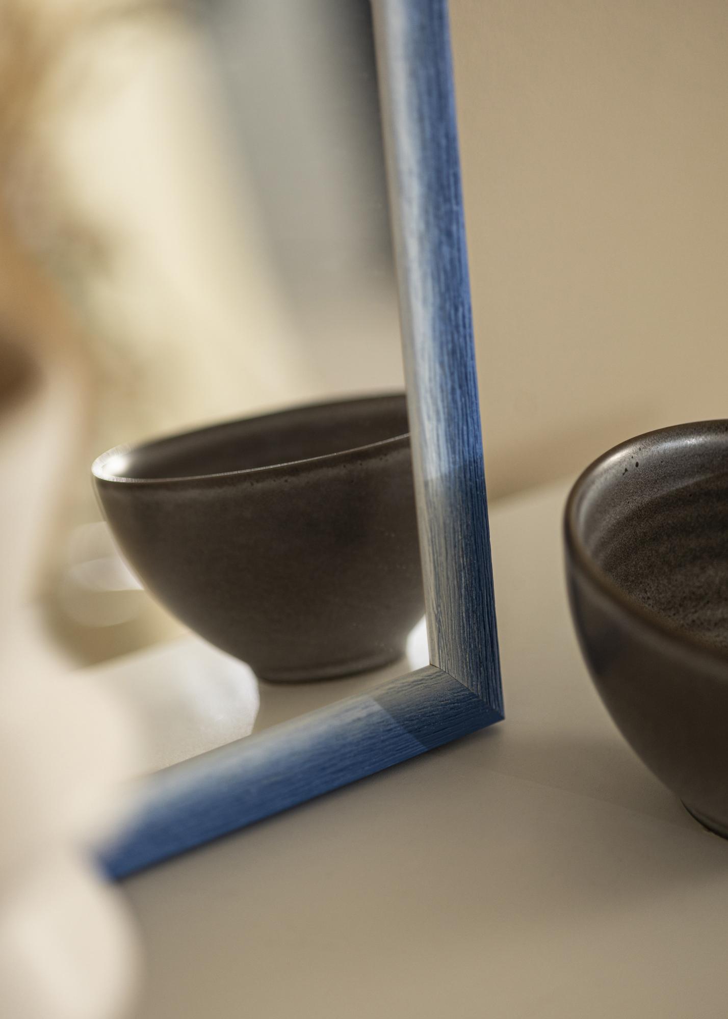 This mirror has a vibrant color palette that shifts from a light, almost white tone to a deeper blue. This variation in color gives the mirror a dynamic appearance that can change depending on the light in the room. The surface has a distinct wood texture with vertical grains, giving it a natural and tactile feel. The transition between the different shades is smooth and gives the frame a hand-painted, unique expression.