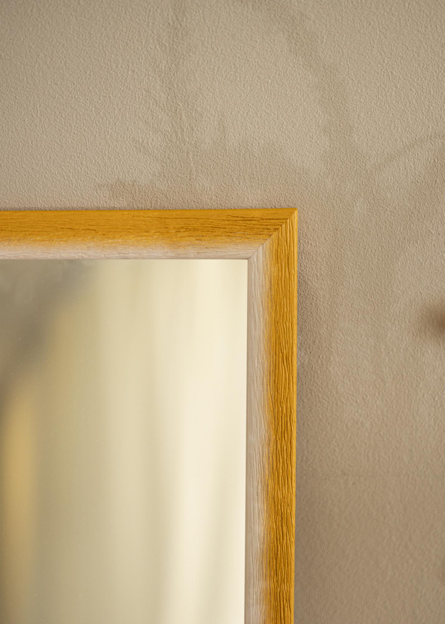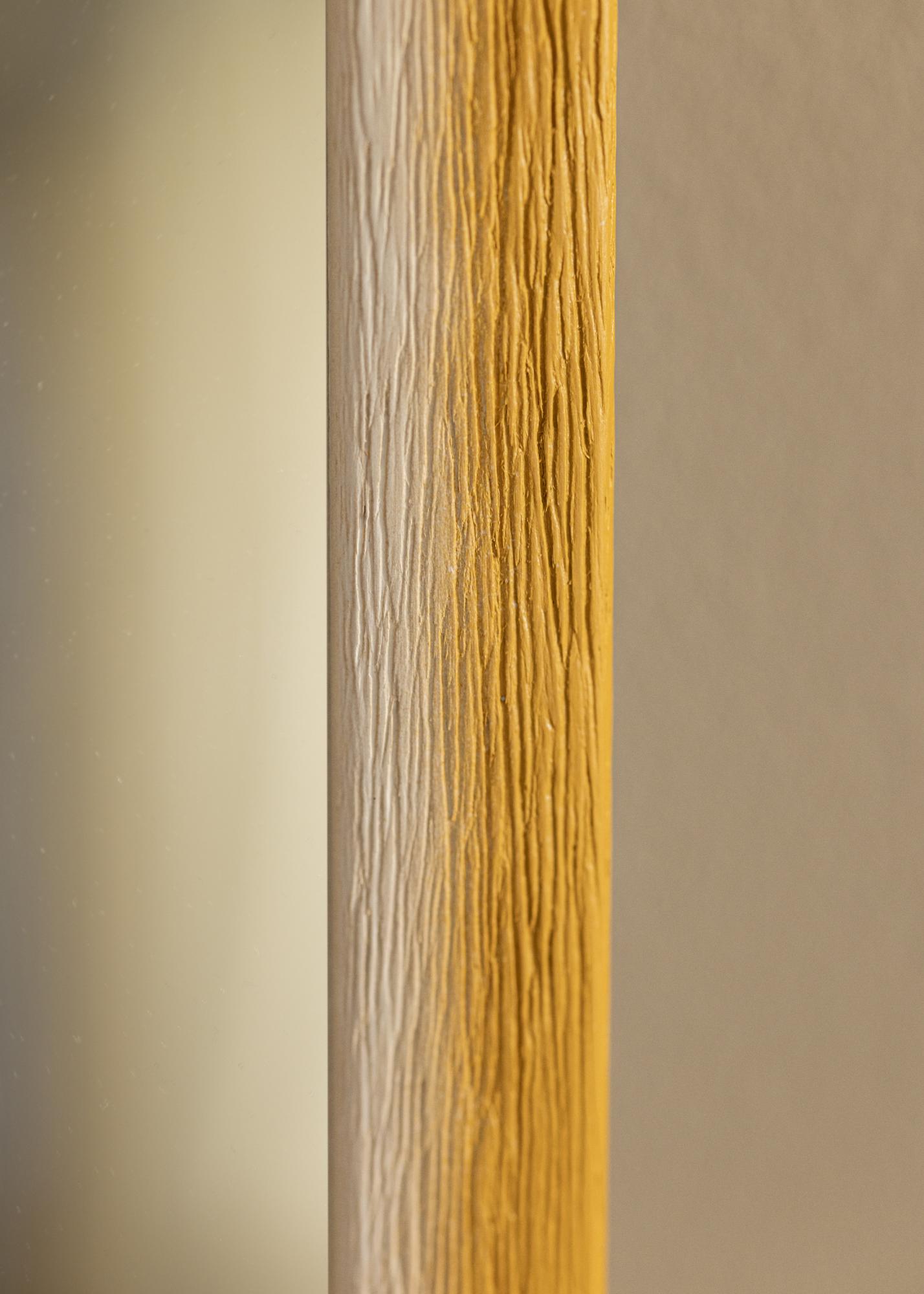 This mirror stands out with its harmonious color transition from a light, natural white tone to a warm ochre-yellow hue. This subtle transition creates a soft, painted expression that gives the room a vibrant depth. The surface of the frame is characterized by a distinct wood structure with deep grains, offering a tactile and natural feel. This makes the mirror not only functional but also a decorative detail in your home.