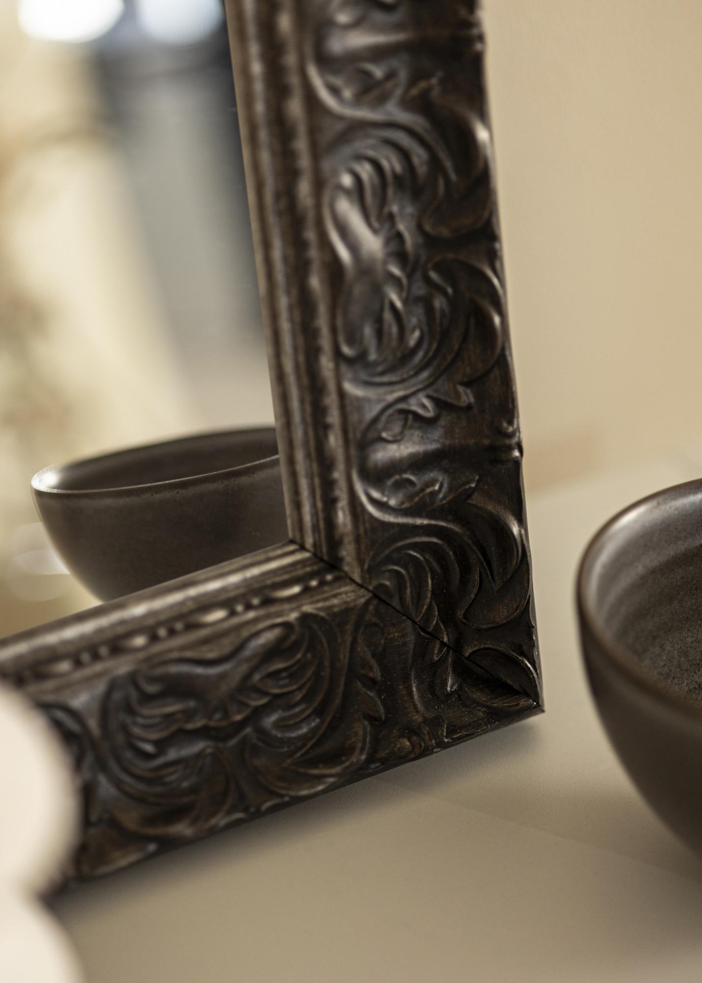 The frame of Mirror Durham Black is 70 mm wide, which gives the mirror a robust and solid feel. The depth of 35 mm contributes to its stability and ensures it sits securely on the wall. Made of pine, this mirror has a dark antique brown finish that gives it an aged look, enhancing its classic and rustic character.