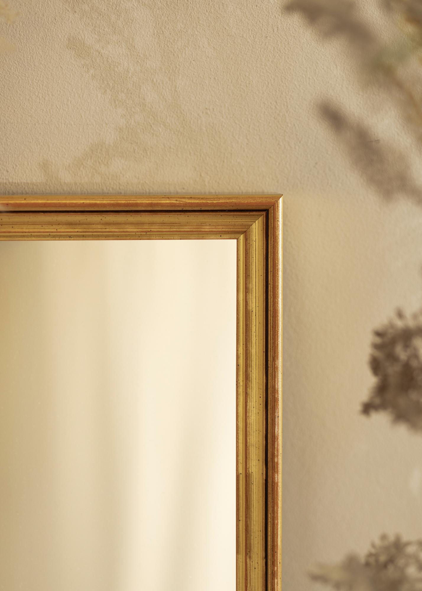 This mirror has a depth of 39 mm, giving it a robust feel without being too heavy or overpowering. Made of pine, it combines durability with a lightness that makes it easy to mount on the wall. The golden surface has a slight antique finish with small dark details, creating a timeless character that suits both modern and classic interior styles.