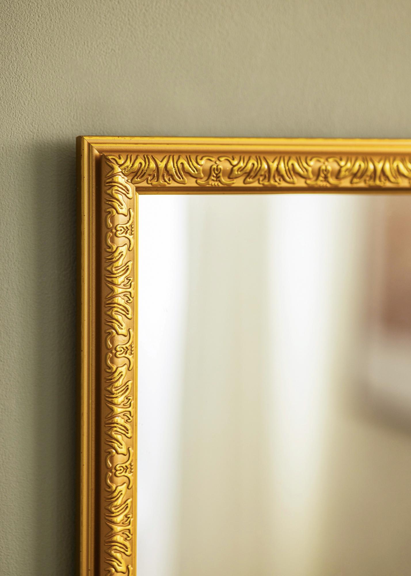 If you're on the hunt for a luxurious gold-coloured mirror, your search ends now. Nostalgia Gold is a wall mirror with a 2.8 cm wide frame featuring an elegant profile and a beautiful decorative pattern. The mirror glass will reflect the light in your room, while the mirror itself becomes a stylish detail on your wall. On the back, there is a wall mount for easier hanging.