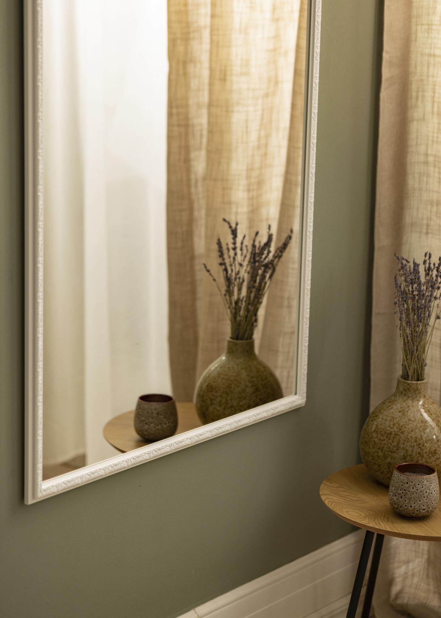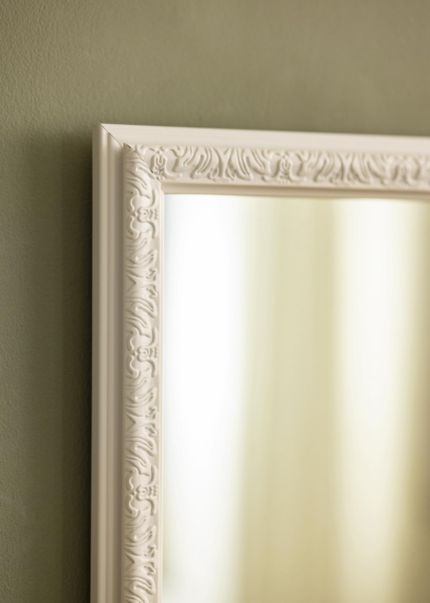This wall mirror is a stylish decor detail that beautifully reflects light from every light source in your room. The white frame has a fresh, bright feel which perfectly complements the beautiful decorative pattern.