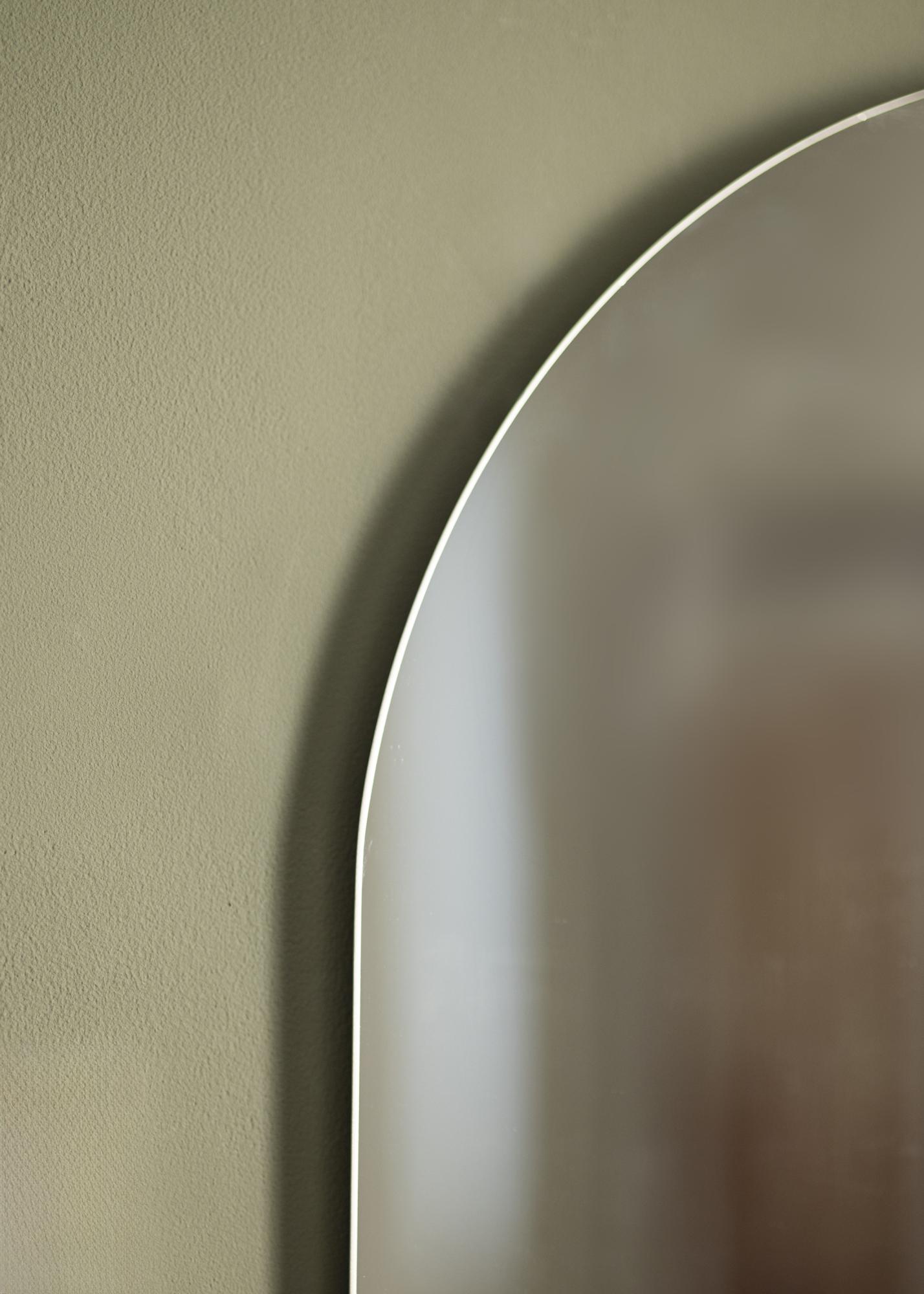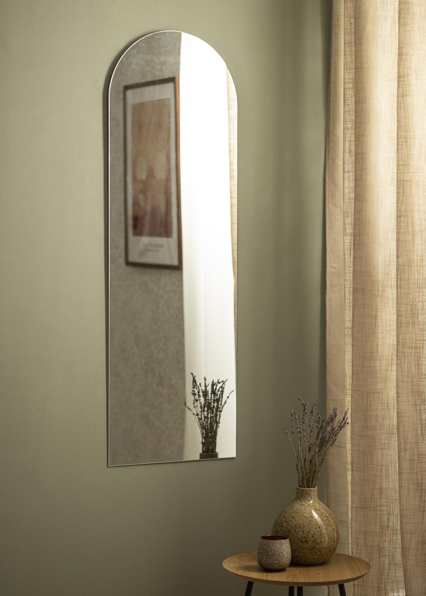 This is an elongated wall mirror that works well as a full-length mirror in the hall or bedroom. It also sits beautifully over pieces of furniture, such as dressers or sideboards, to create a dynamic contrast. The wall mirror has a minimalist design with an arched shape and no frame. The mirror glass is thin to add to the elegance.