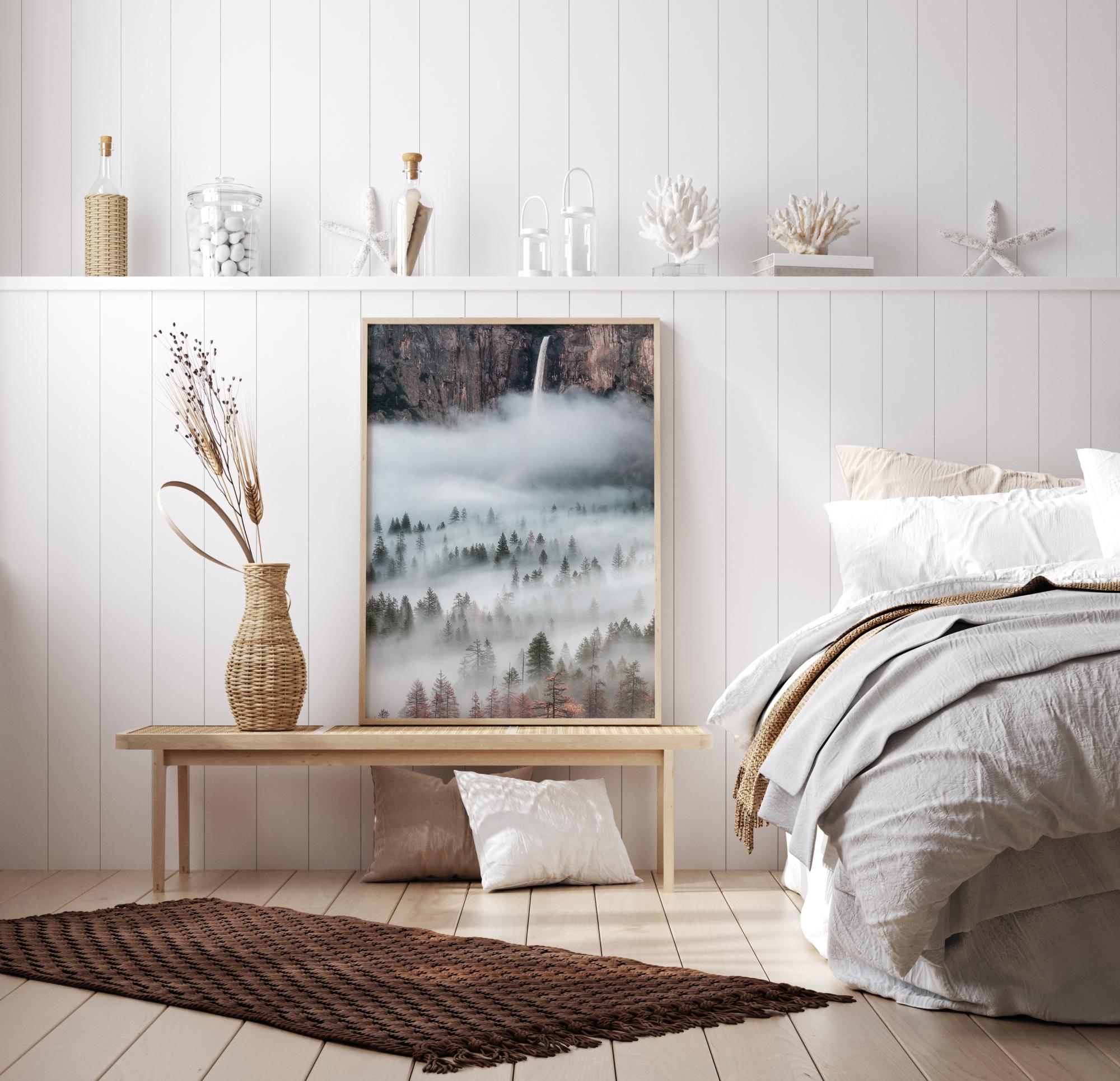 A wonderful photograph of a misty hillside with some rocks and a spectacular waterfall in the background. The cloudy mist hovers peacefully, bringing a feeling of a cool morning to beautify your home. The wonderful autumn colours and the hovering mist bring a sense of mystery.