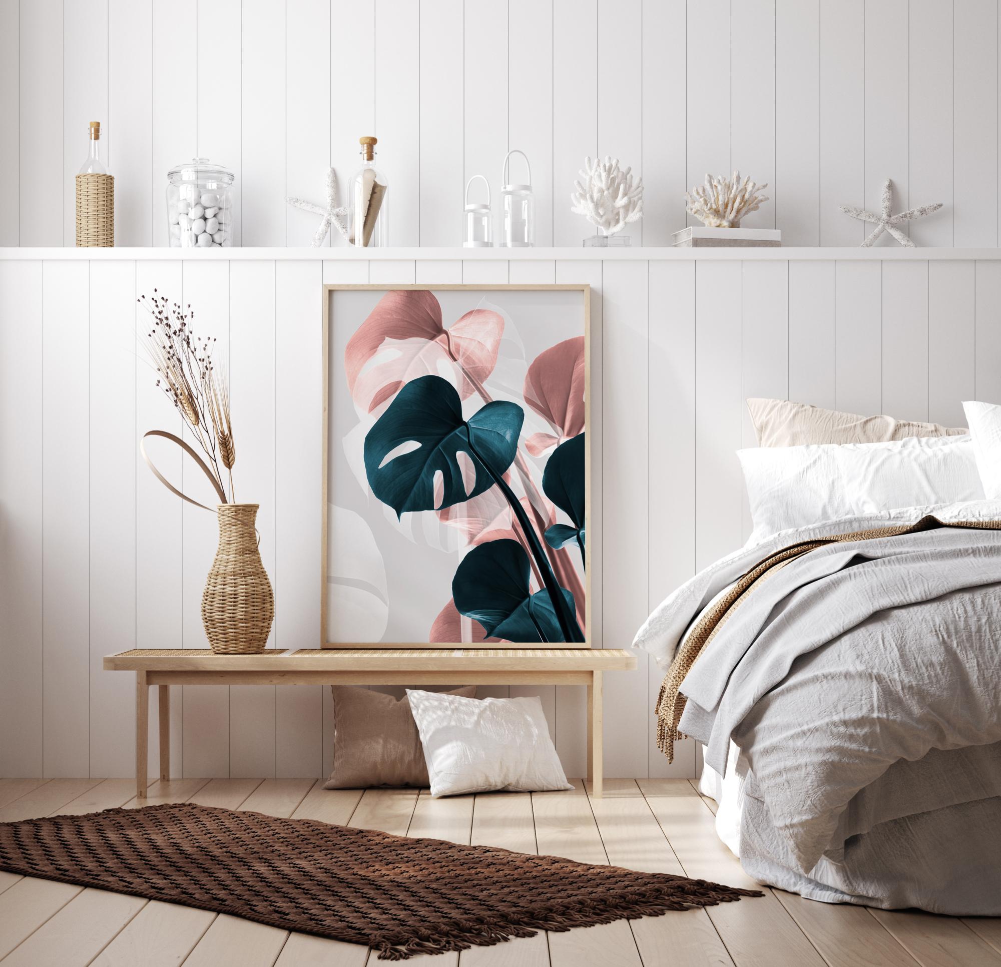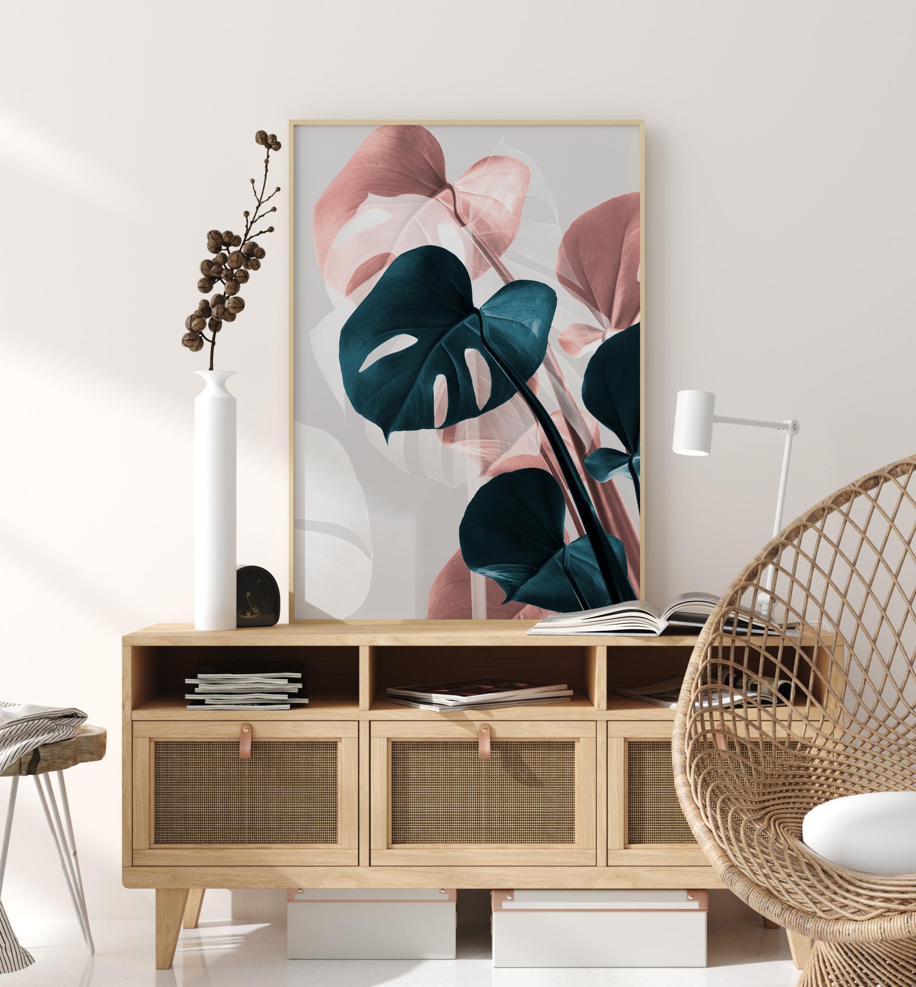 A beautiful picture of pink and dark-green Monstera leaves showing the faultless creativity in their leaves. Set on a beige coloured background, the heart-shaped leaves glow with their beautiful green and pink leaves. The pinnate structures brings and exciting feeling to your home.