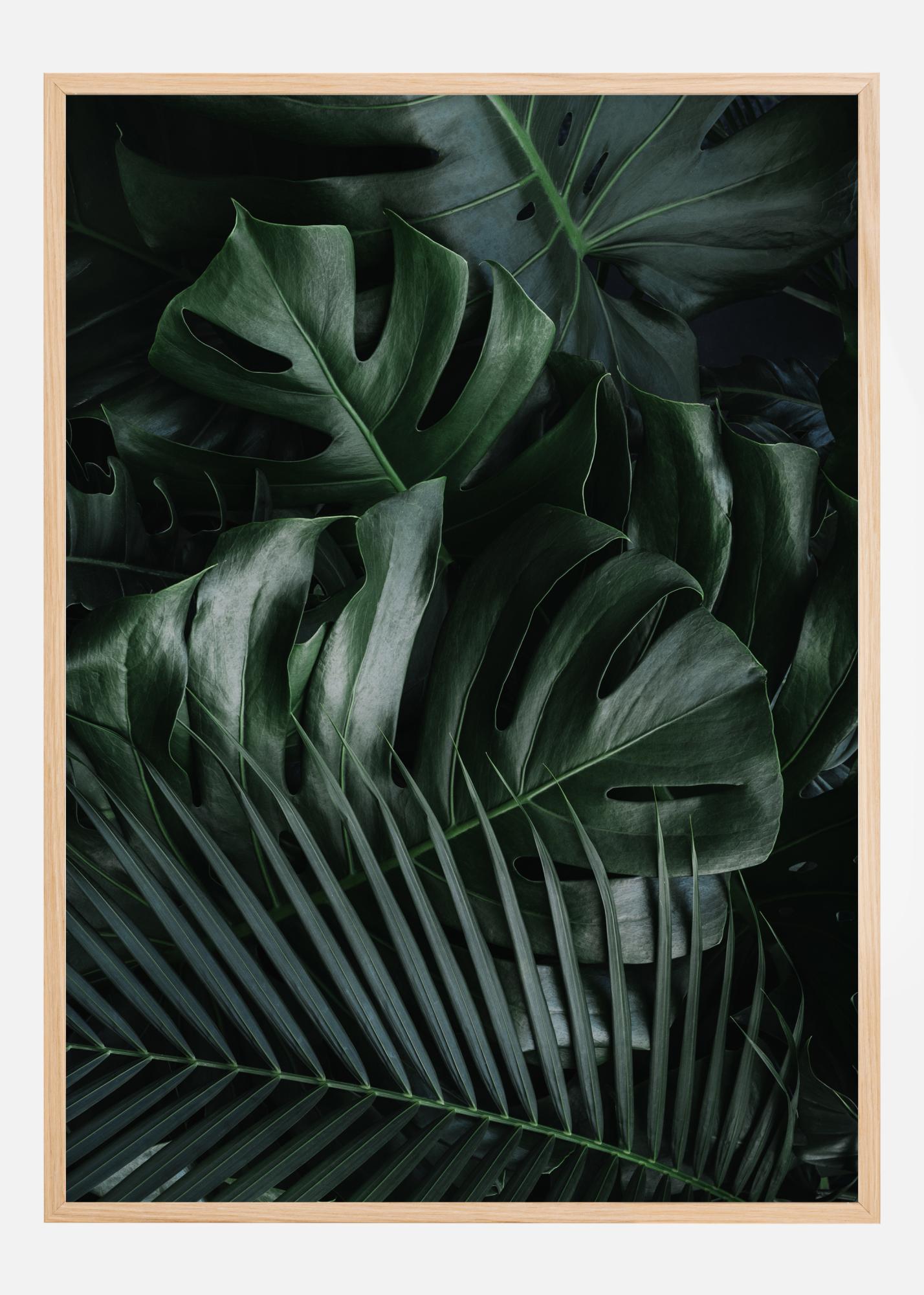 A leafy portrait of green Monstera and palm leaves. The natural light shines on the top part of Monstera leaves creating darker shades in the upper part of the print. The whole saw-shaped leaves create a warm relaxing feeling. A perfect print for anyone who loves plants.