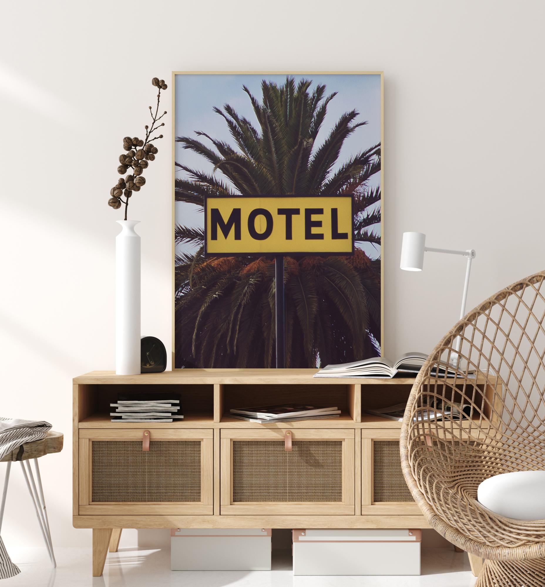 A simple amd clear print of a Motel signpost in front of a big palm tree bracing the blue sky. The black writing has been written on the yellow surface of the poster. The huge palm tree branches have different coloured leaves ranging from green to light brown. A perfectly print for a motel reception wall.
